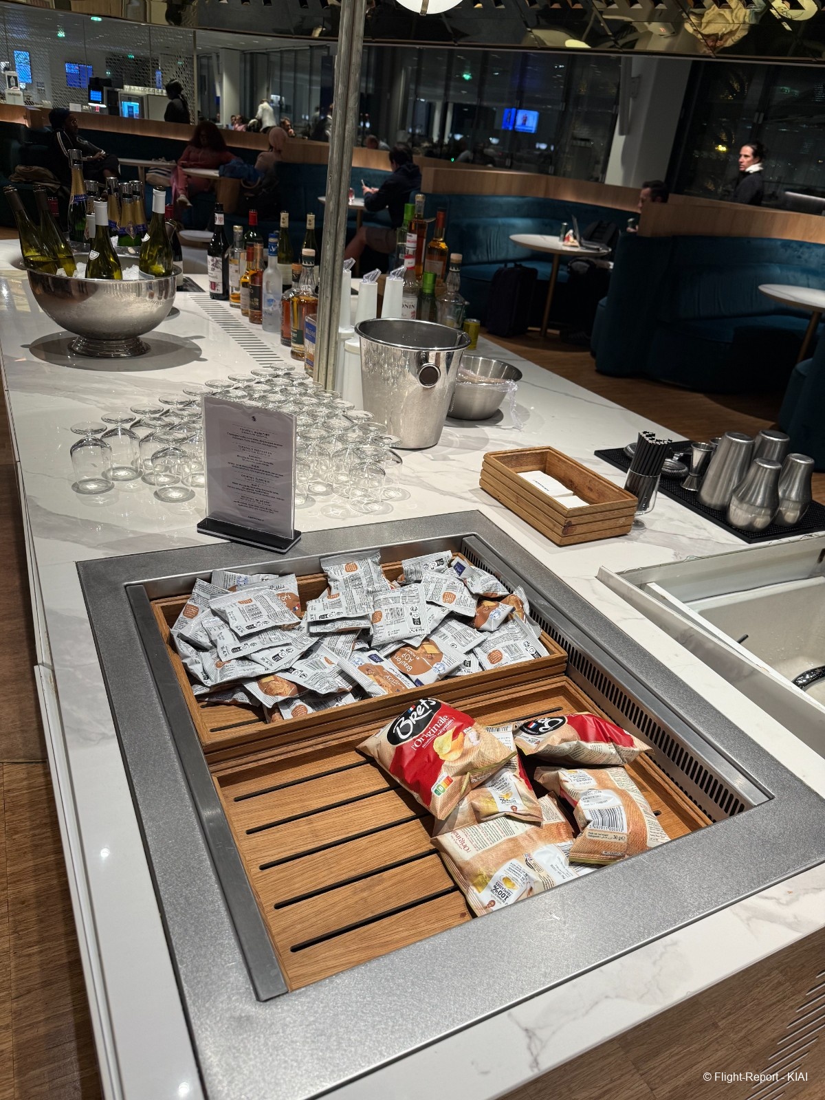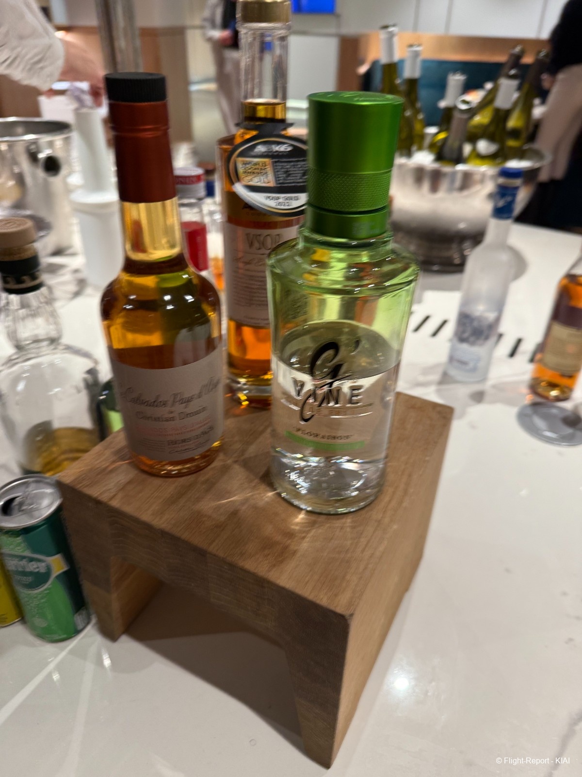 Sur le comptoir, on trouve une sélection d'alcools incluant un rhums et un VSOP, ainsi qu'une bouteille de gin G'Vine, et des snacks notamment.