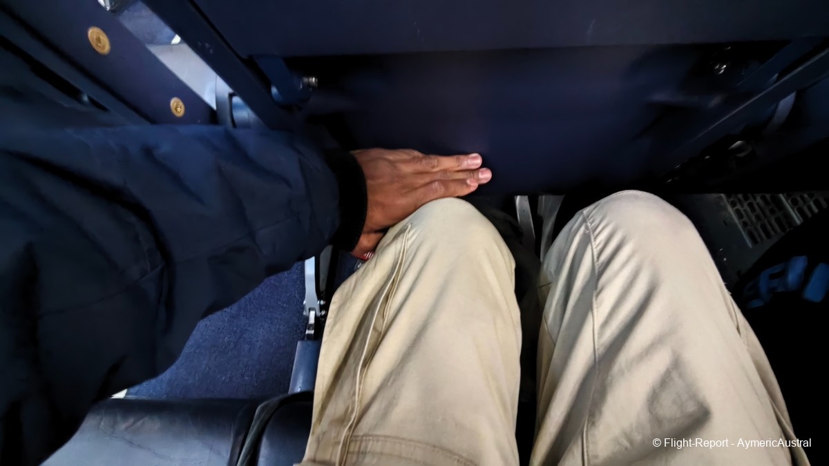 Notre siège sera celui-ci, le 24F, situé derrière l'aile droite avec un beau visuel sur le winglet en V. Le pas avec le siège avant n'est pas si différent des B737-800.