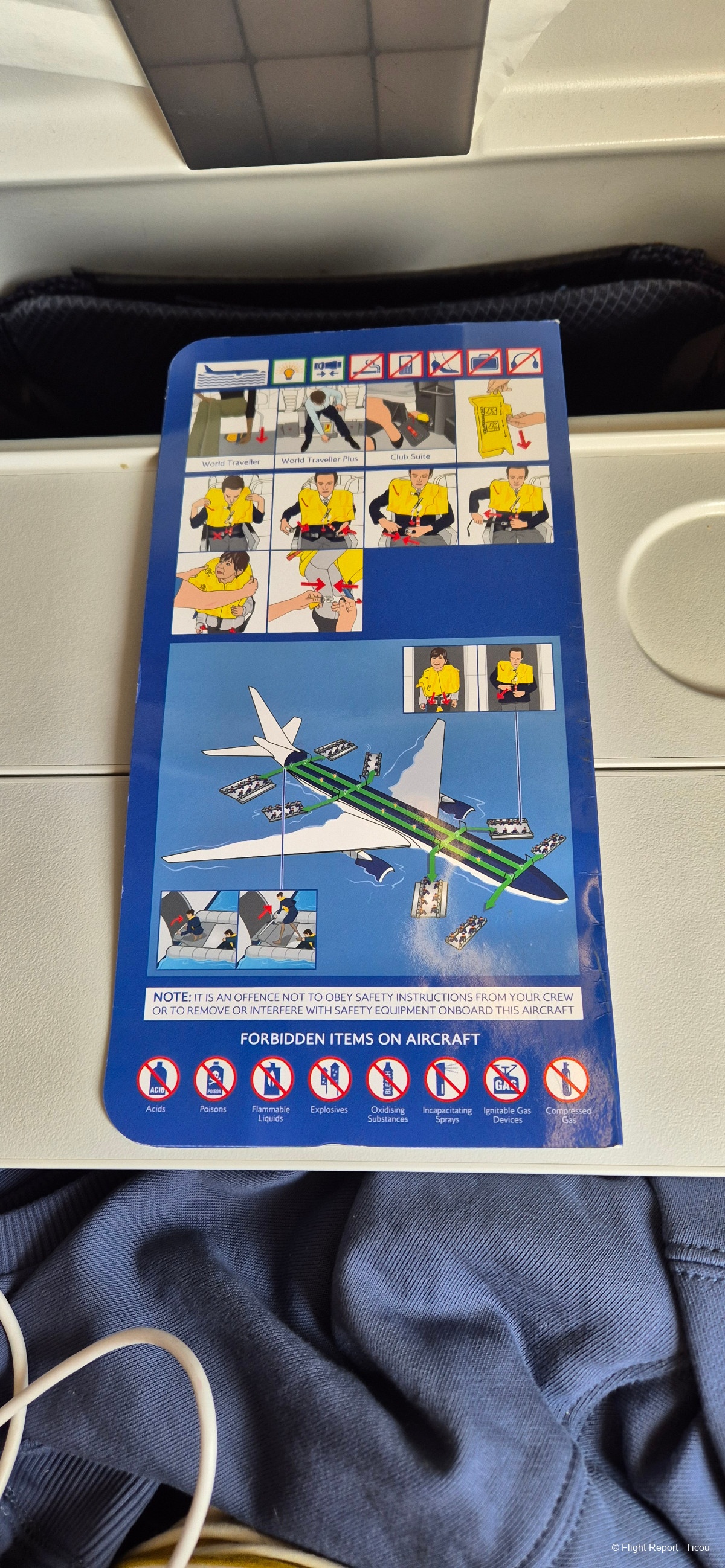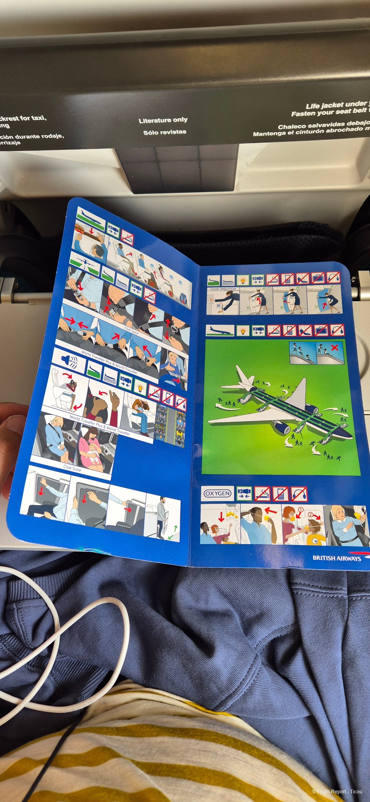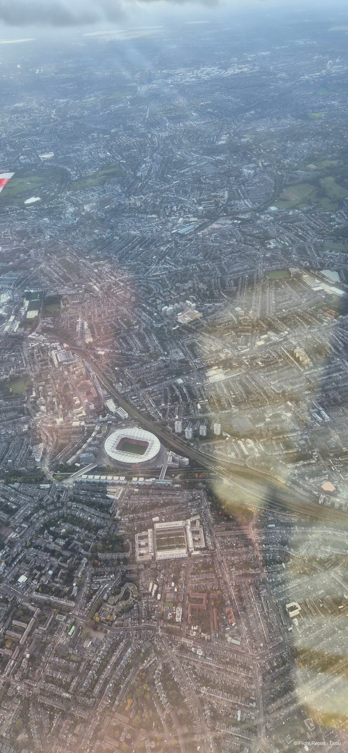 Trente minutes avant l'atterrissage, les lumières sont totalement rallumées et le personnel naviguant commercial s'efforce de préparer la cabine en vue de notre arrivée à LHR. Les caches hublots sont remontés et je me dis qu'il serait temps d'immortaliser les fiches de sécurité de cet A350. J'y ajoute également une vue aérienne du Nord de Londres où on reconnaît le stade de football d'Arsenal qui porte le nom d'une compagnie concurrente à BA, ainsi que l'ancien Highbury qui a longtemps accueilli les Gunners.