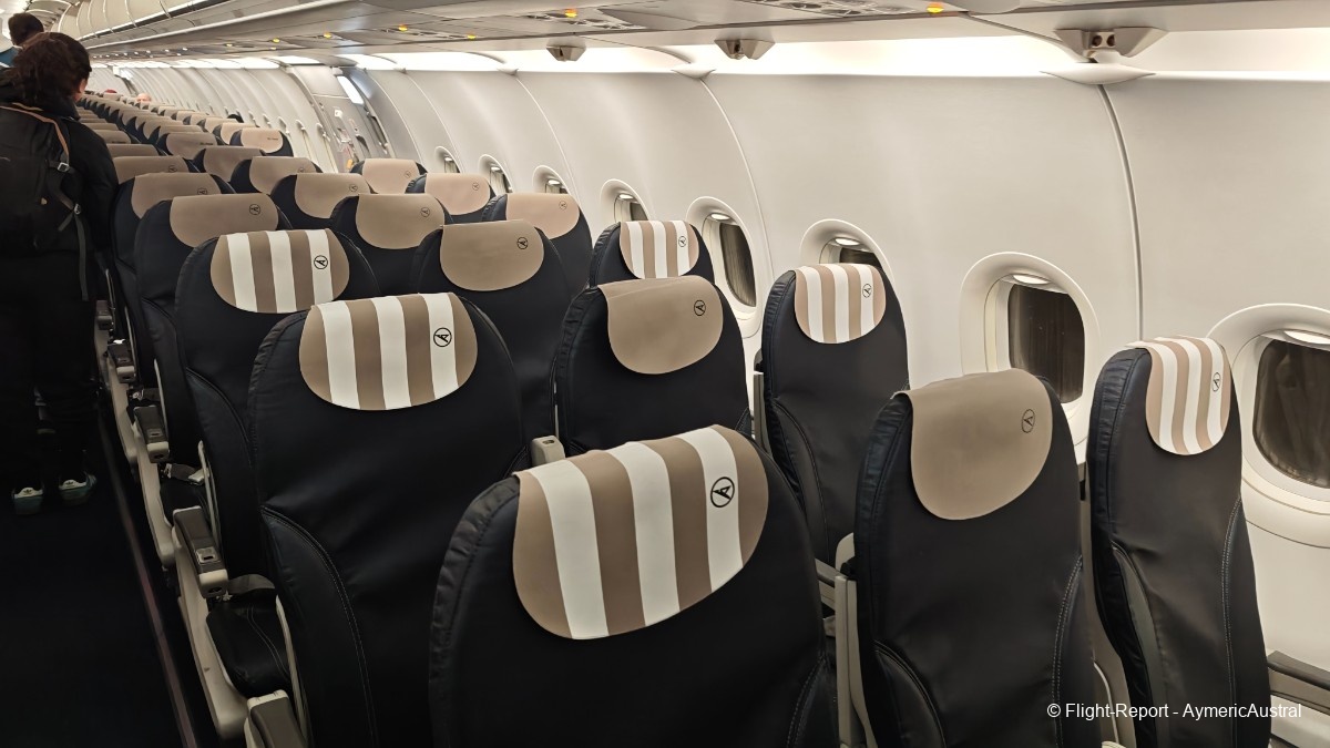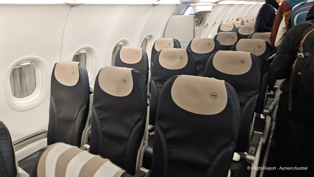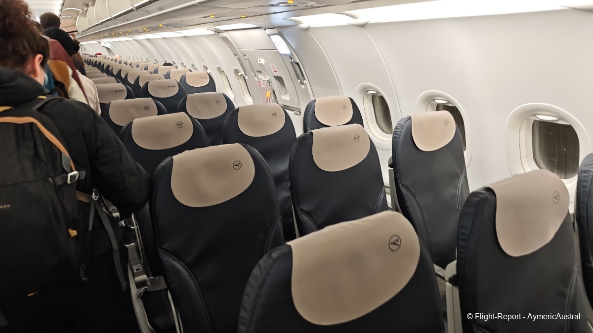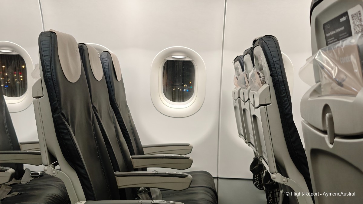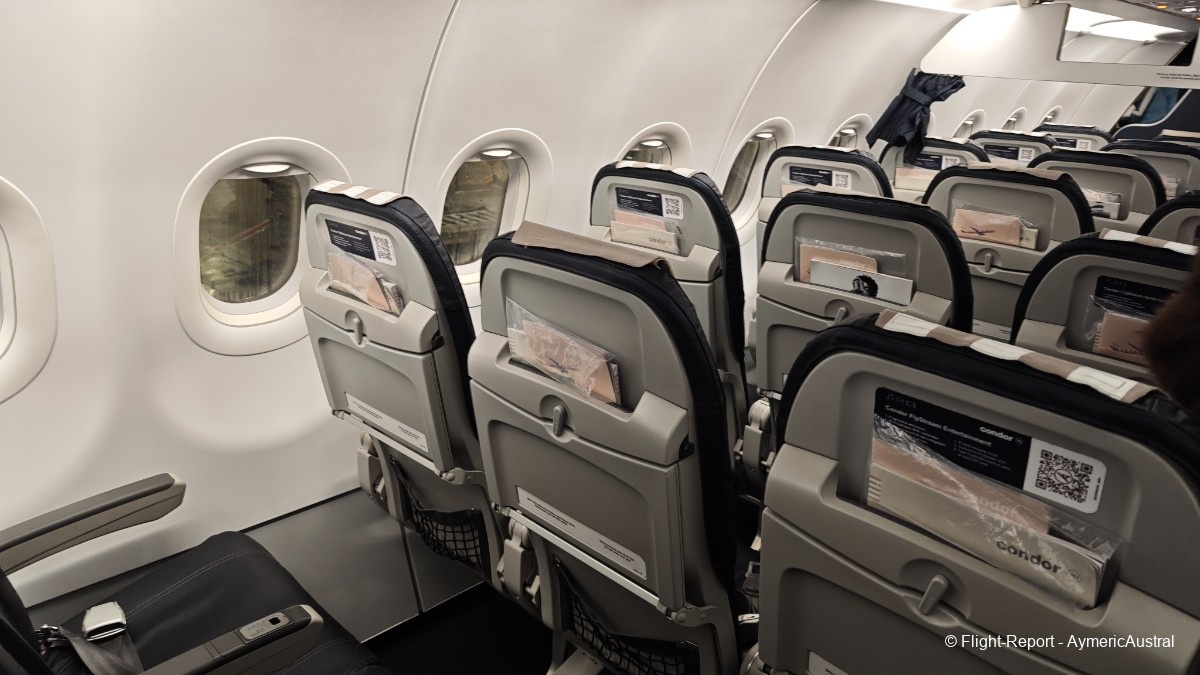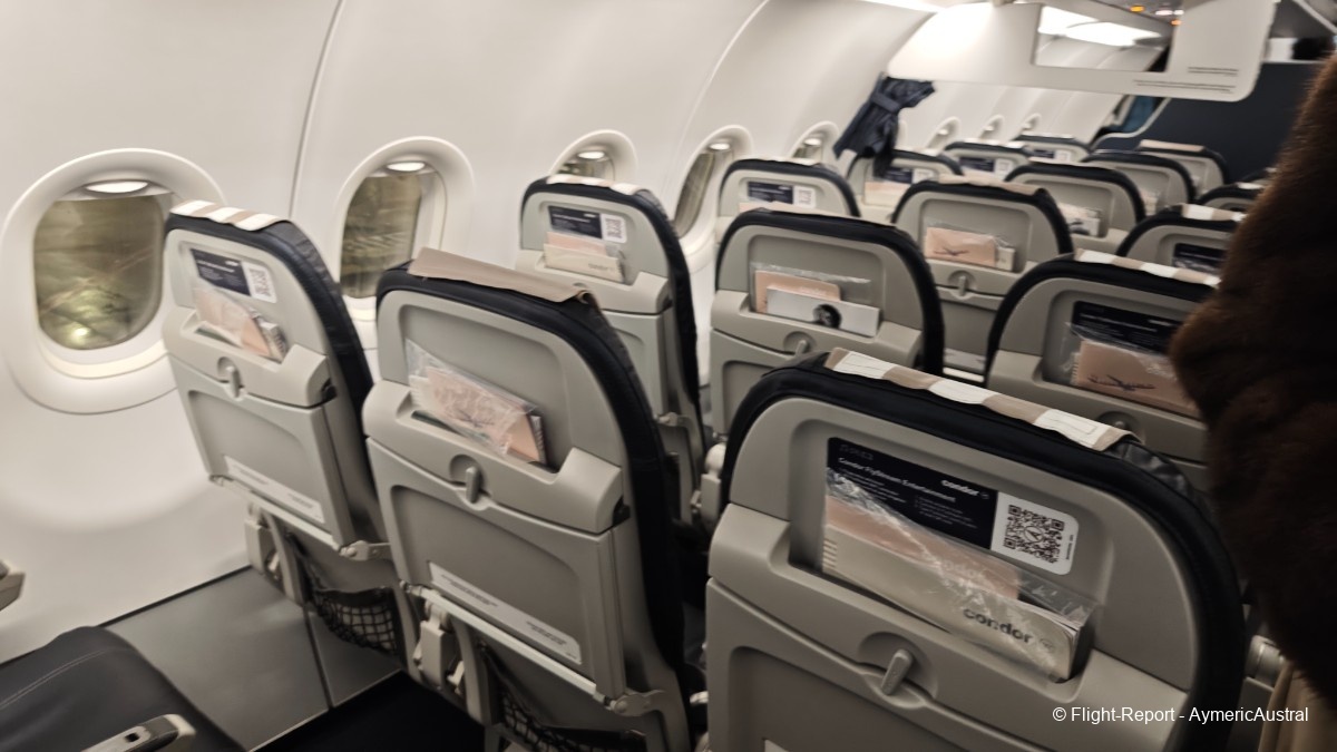 Concernant Condor, l'avion possède une cabine classique configurée en 3-3 avec deux classes pouvant accueillir jusqu'à 220 passagers, dont 24 en classe Économie Premium. La nouvelle cabine est très sympathique avec ses couleurs noir et beige !