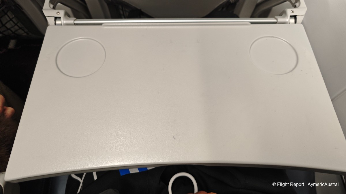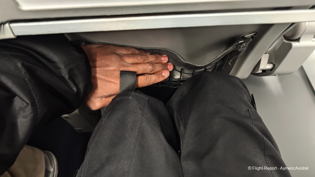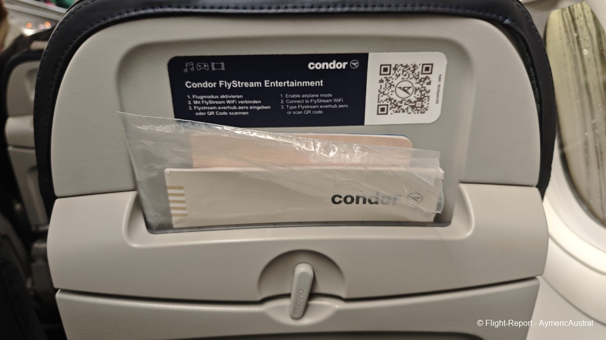 Nous voici à notre siège, le 8F. L'alignement avec le hublot est excellent. Le "pas" (espace pour les jambes) avec le siège avant n'est pas le meilleur, mais pas le pire non plus ; pour une heure de vol, c'est plus que correct. La tablette est grande et propre. En haut du siège se trouve une petite pochette où l'on peut retrouver le magazine Condor, la fiche de sécurité ainsi qu'un sac à vomi.