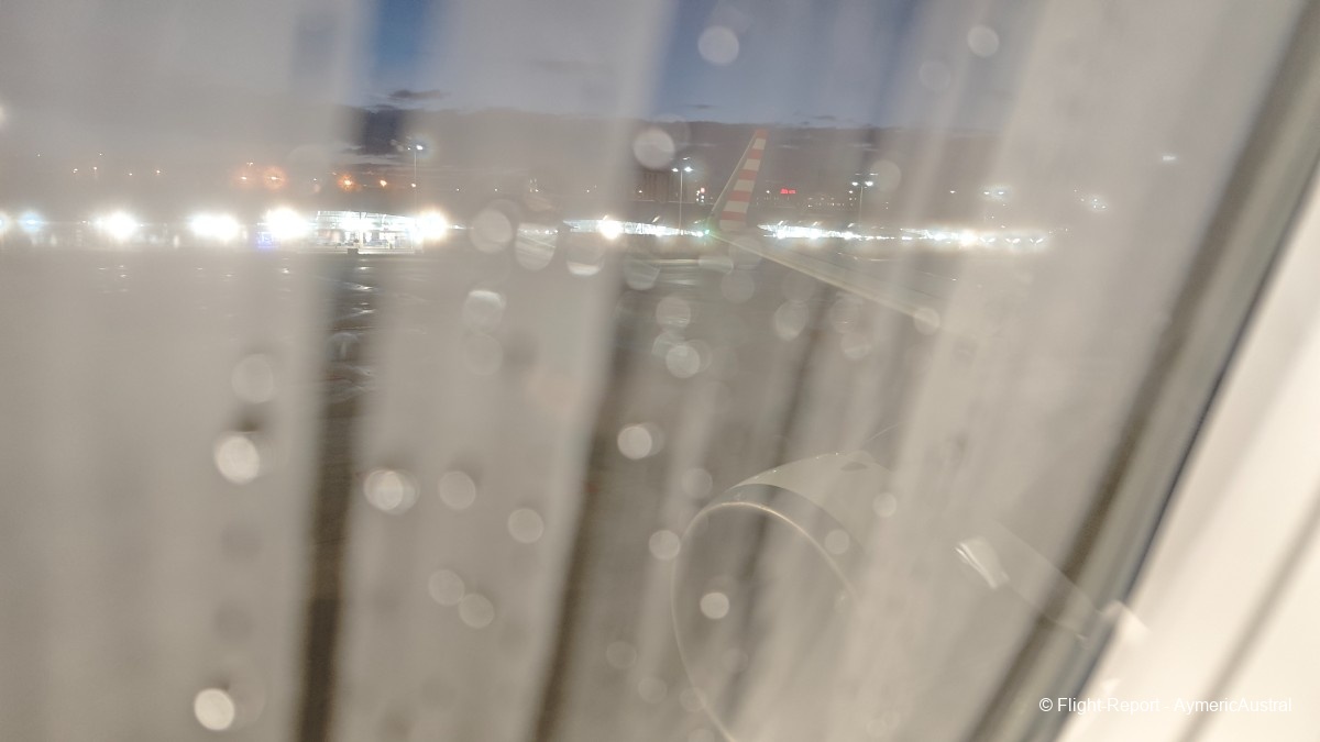 Pas évident de voir dehors avec la buée sur le hublot. Les consignes de sécurité nous sont démontrées, et le roulage suivra peu de temps après, direction les pistes Sud.