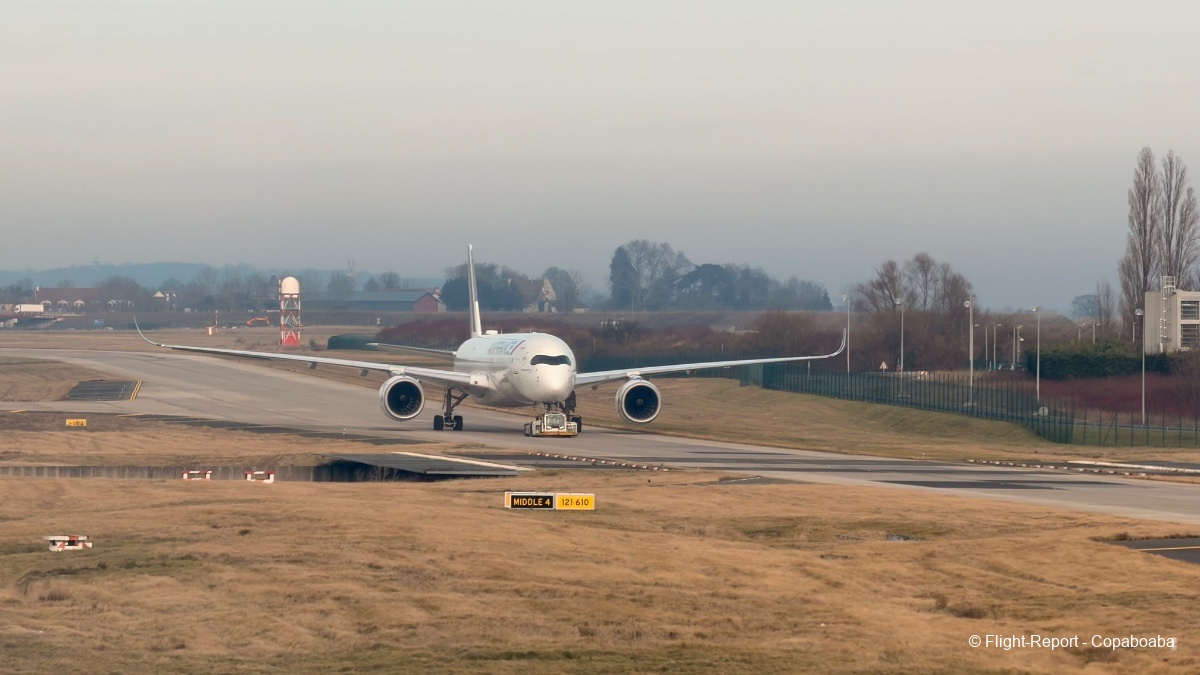 L'avion qui nous emmènera outre-Atlantique est un A359 immatriculé F-HUVA. Il s'agit du premier A350 d'Air France dans la configuration 48 sièges en classe Affaires, 32 en classe Premium et 212 en classe Économie.