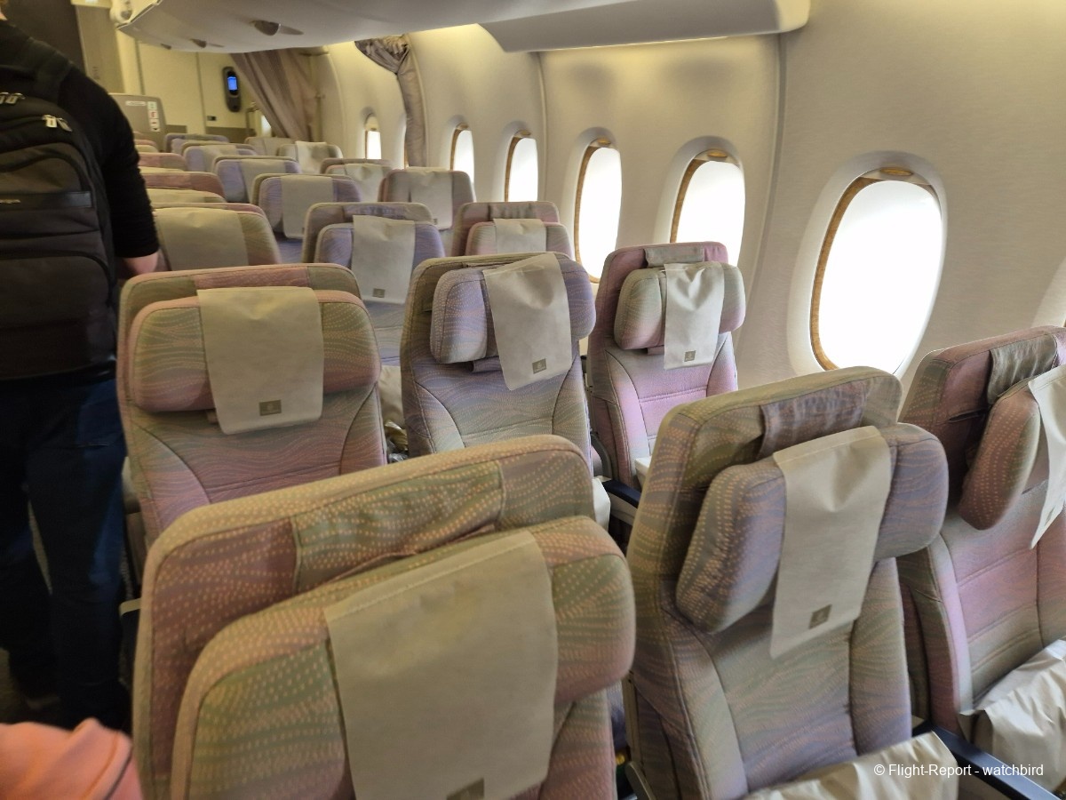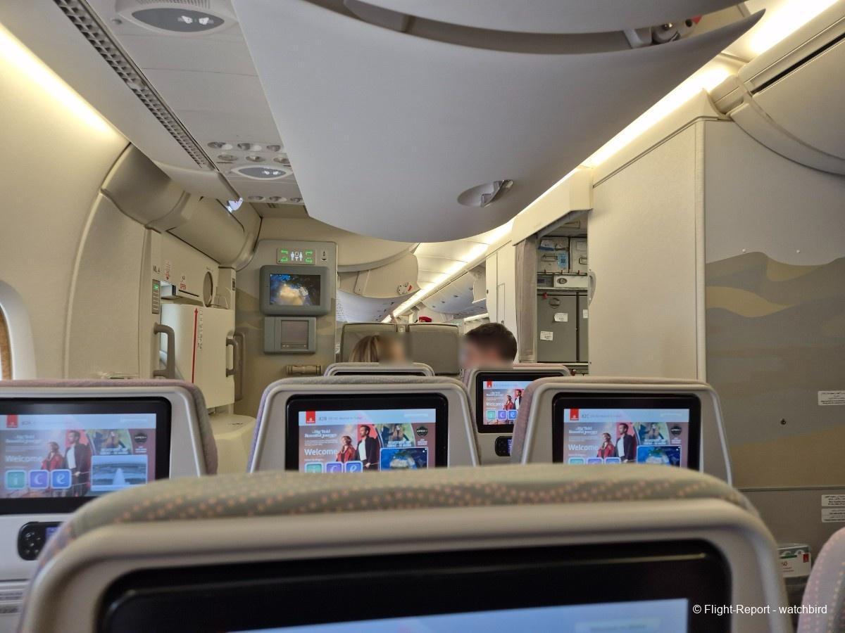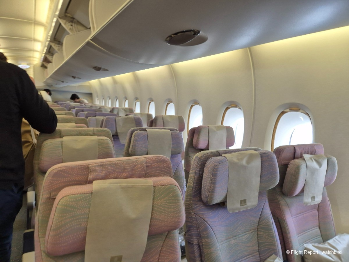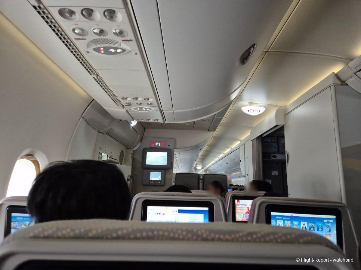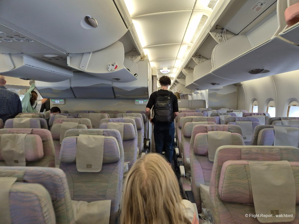Comme j'avais pris un siège vers l'arrière de l'appareil on le traverse en entier. Ca permet de voir qu'il s'agit d'une version avec des sièges récents mais sans premium eco.