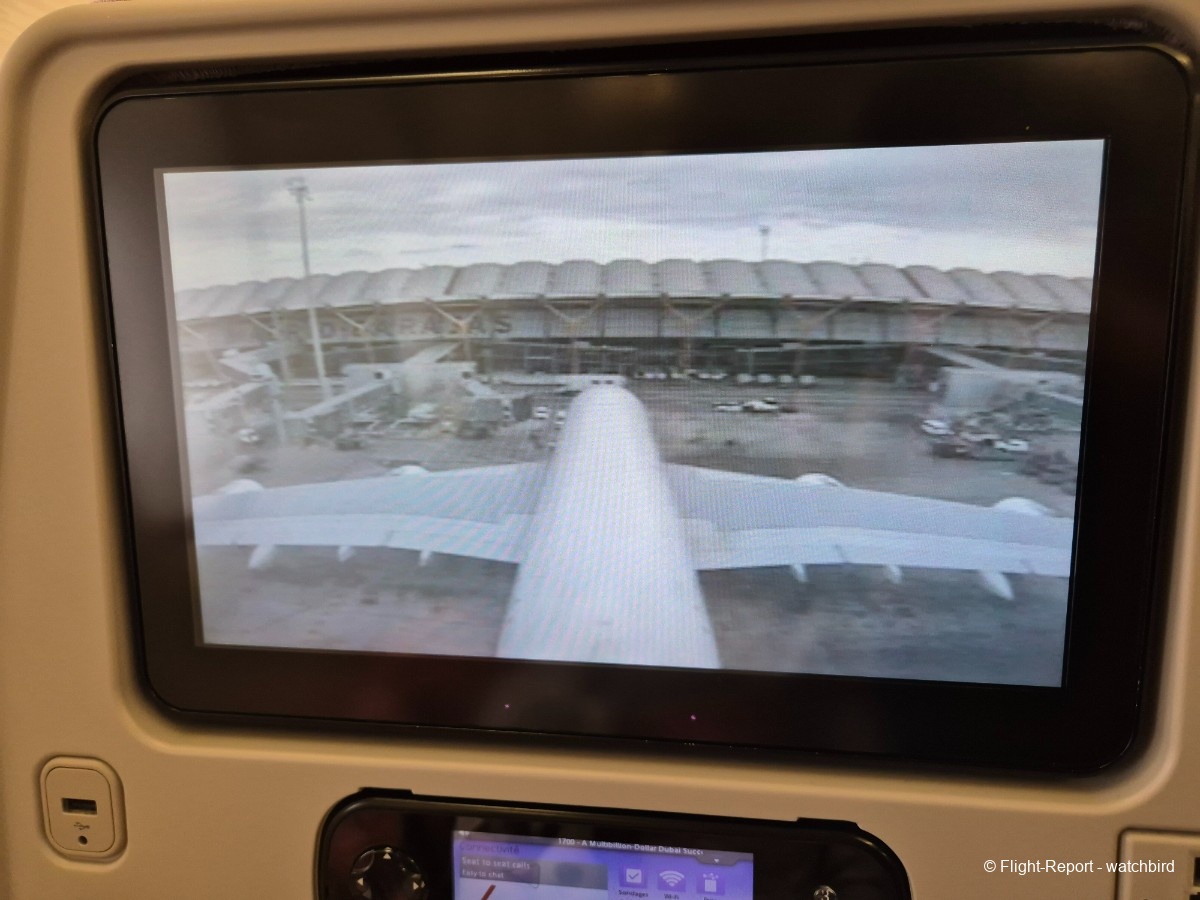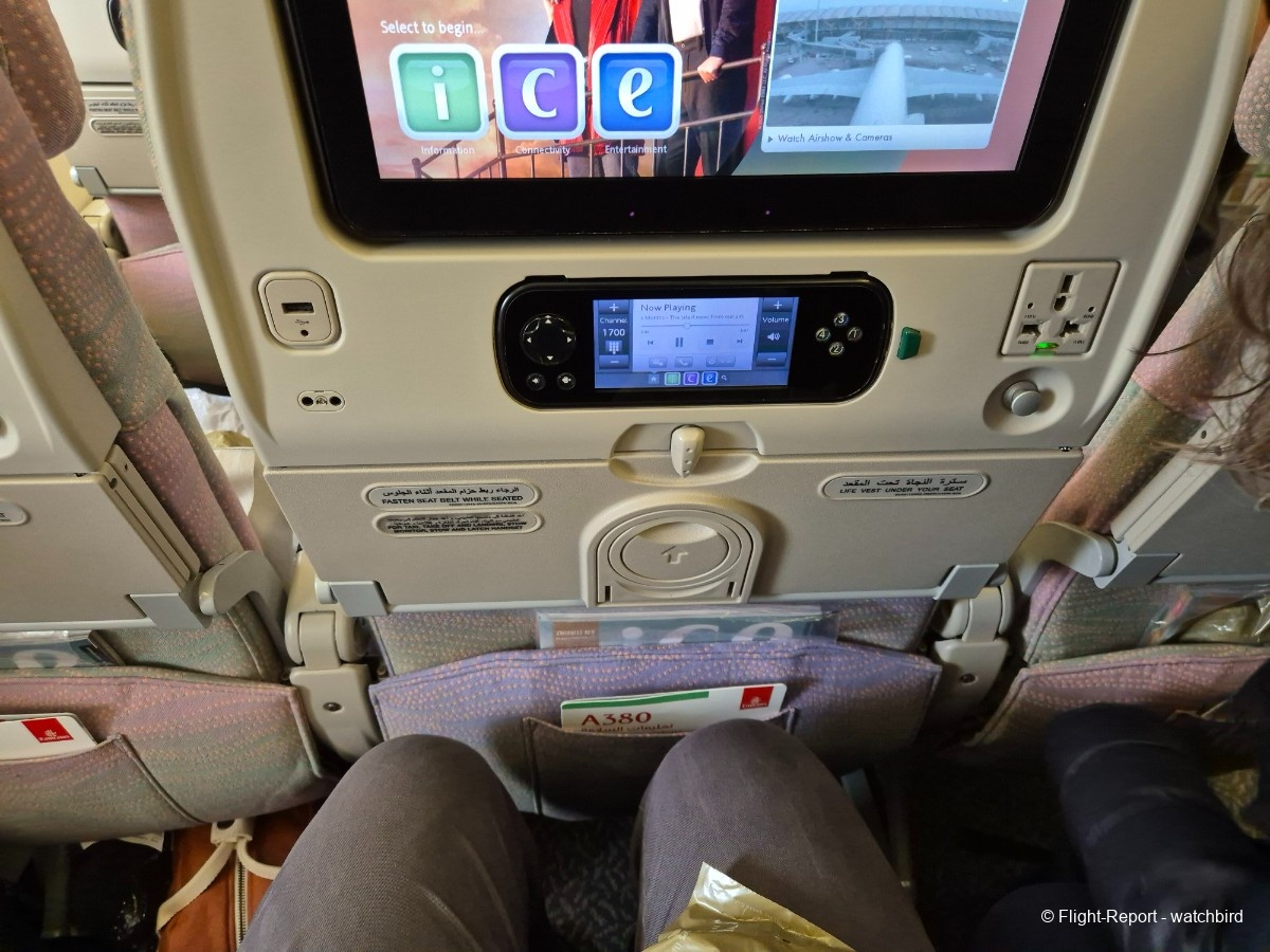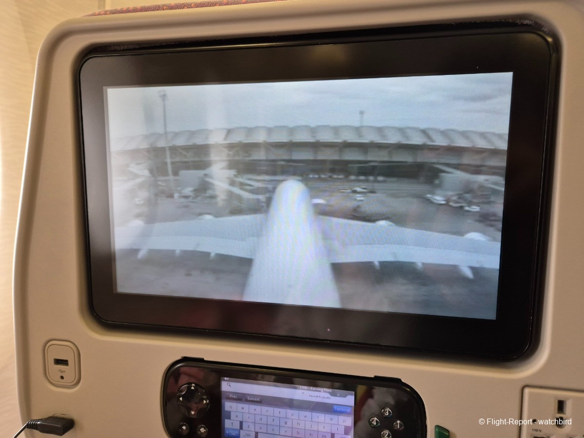 Me voilà installé, un peu plus de place pour les jambes, un peu plus de largeur aux épaules aussi par rapport à tous nos vols sur cette série ! Merci l'A380. On voit à la taille et qualité de l'écran que c'est plus récent que certains mais moins que d'autres.