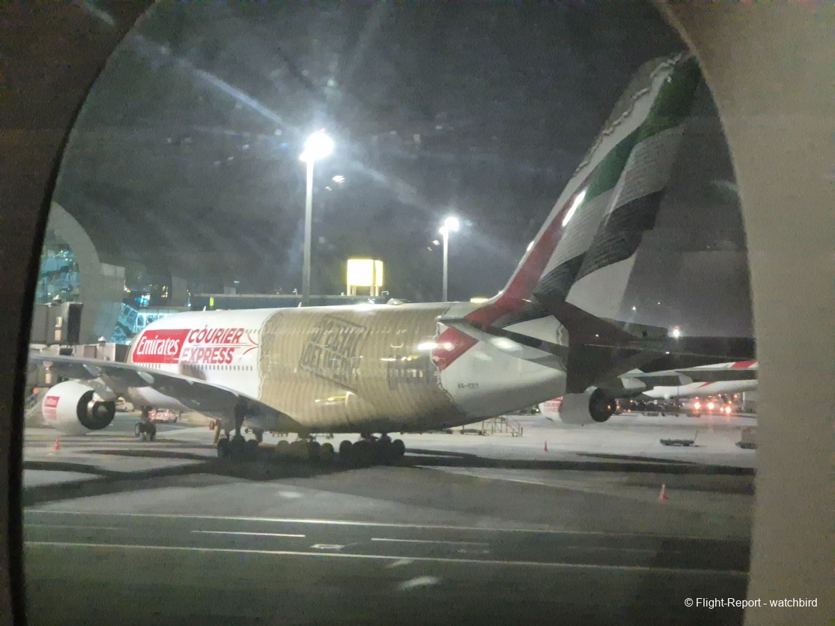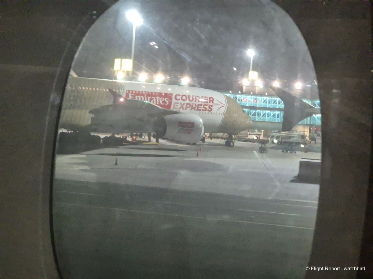 Le roulage est court avec une porte au Terminal 3 Satellite A (pas de record en vue pour l'arrivée du coup). Au passage petit coup d'œil sur la livrée spéciale "Emirates Courier Express" sur un A380.