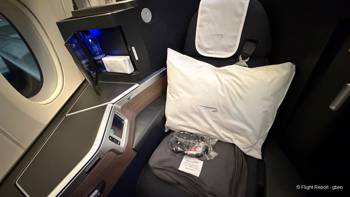 Sur le siège sont disposés oreillers, ensemble de surmatelas et couverture, casque audio. La trousse de confort est déjà proposée ainsi qu'une bouteille d'eau.