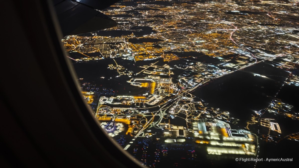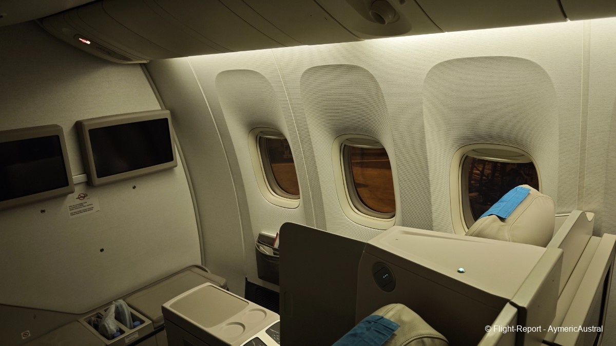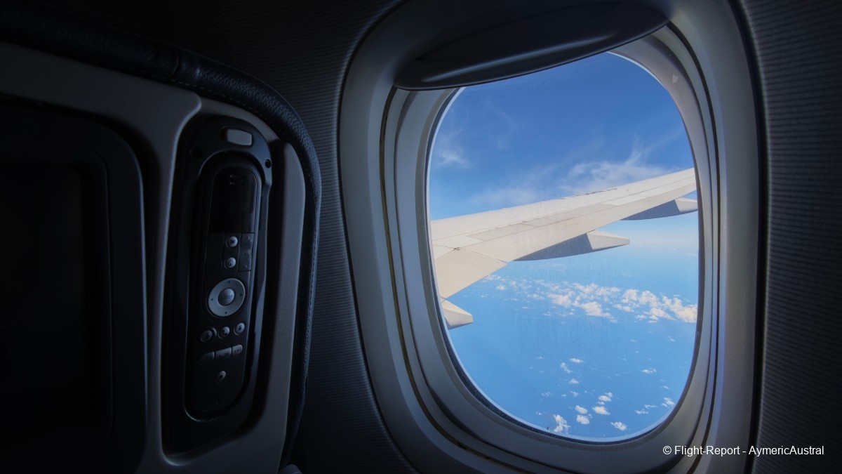 Nous voilà à notre siège, le 35K/L. Le pas et l'armement sont quasiment les mêmes, à la seule différence près que la trousse de voyage a changé. Trousse qui est devenue en plastique… l'autre était mieux, même s'ils ont essayé de faire mieux habillé avec le dessin dessus. La vue sur l'aile qui nous accompagnera pour les 11 h de vol est top !