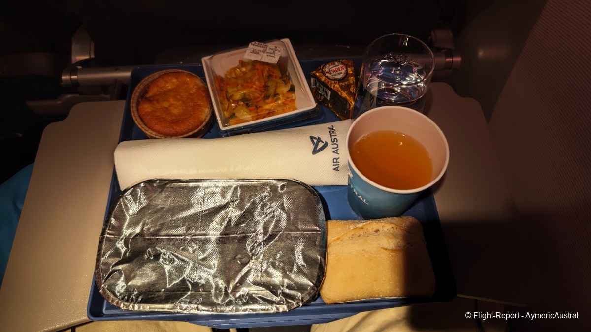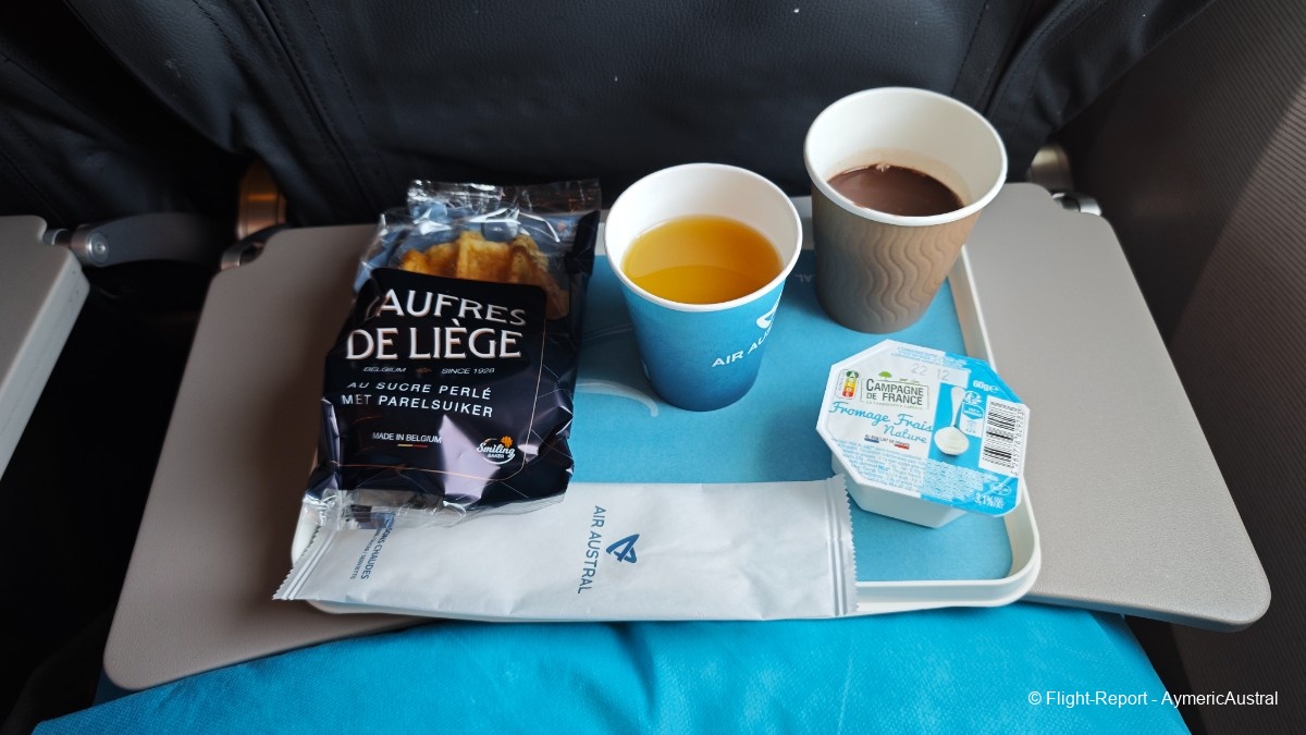 À l'extérieur, le soleil s'est bien levé. Il reste 1 h avant d'atteindre La Réunion, le petit-déjeuner nous est servi.