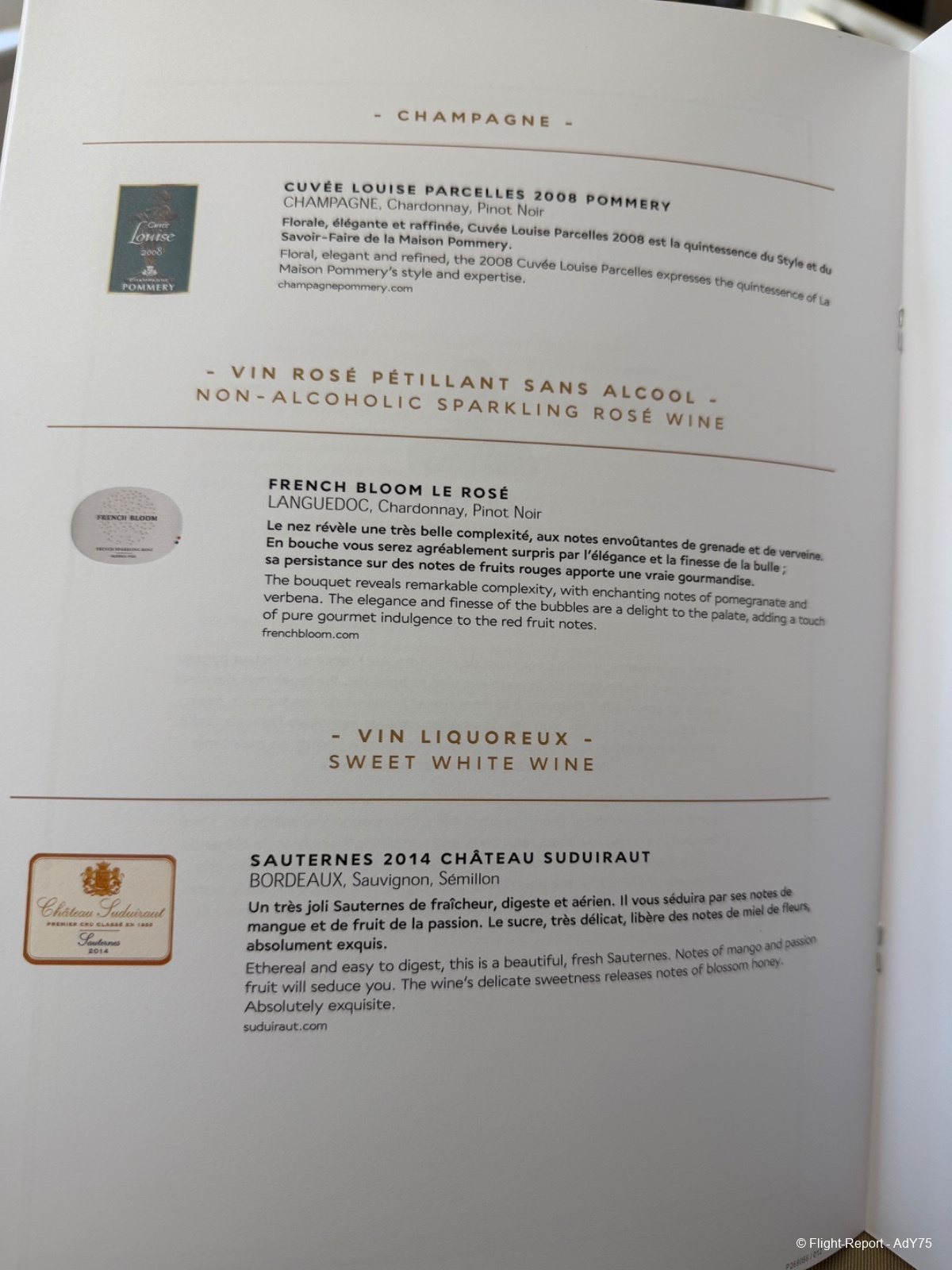 Pour les vins en revanche c'est pas mal ! J'apprécie beaucoup le champagne sélectionné et on notera l’apparition du « Bloom », un pétillant sans alcool que ma femme a testé et approuvé à Noël.