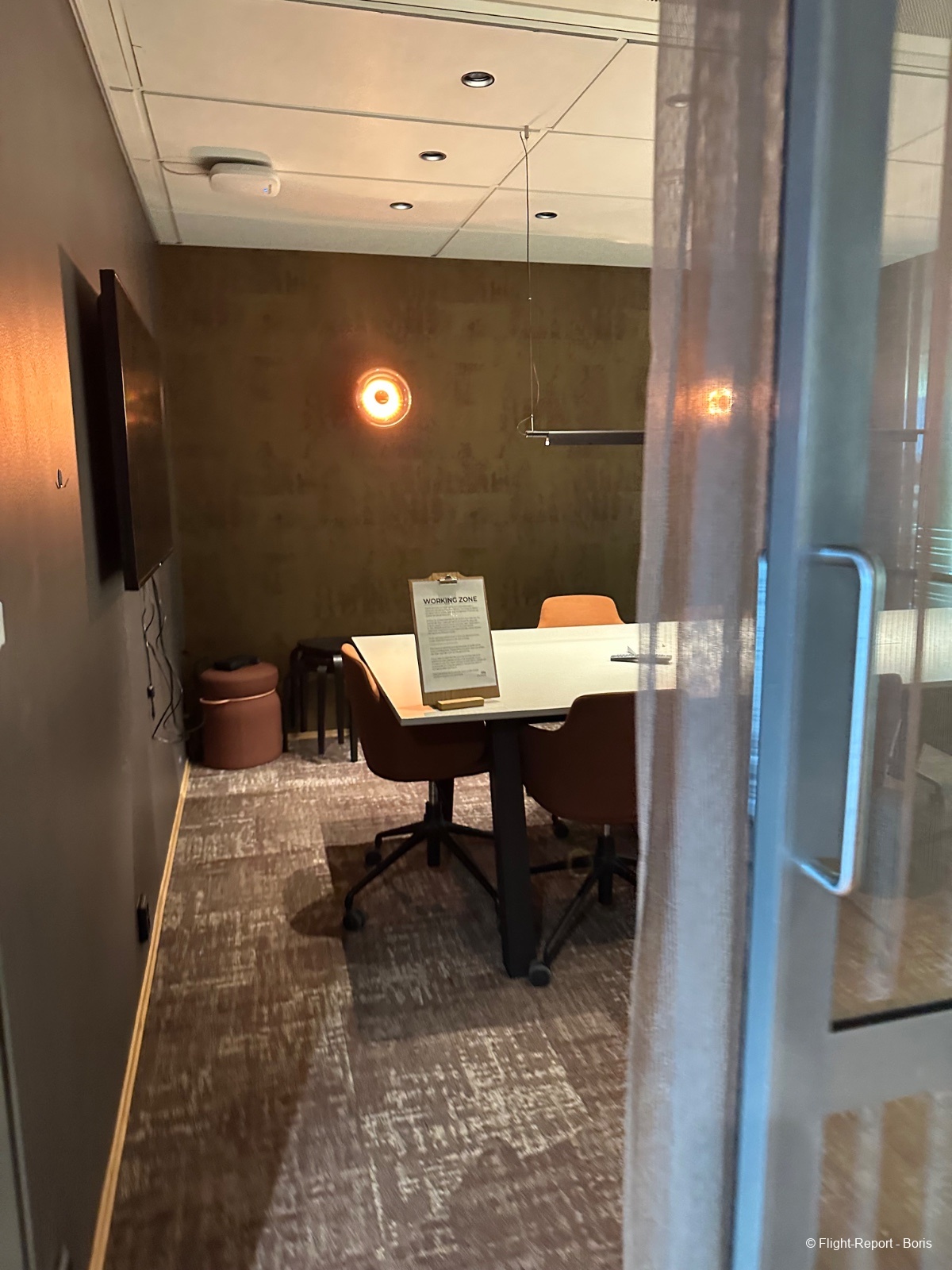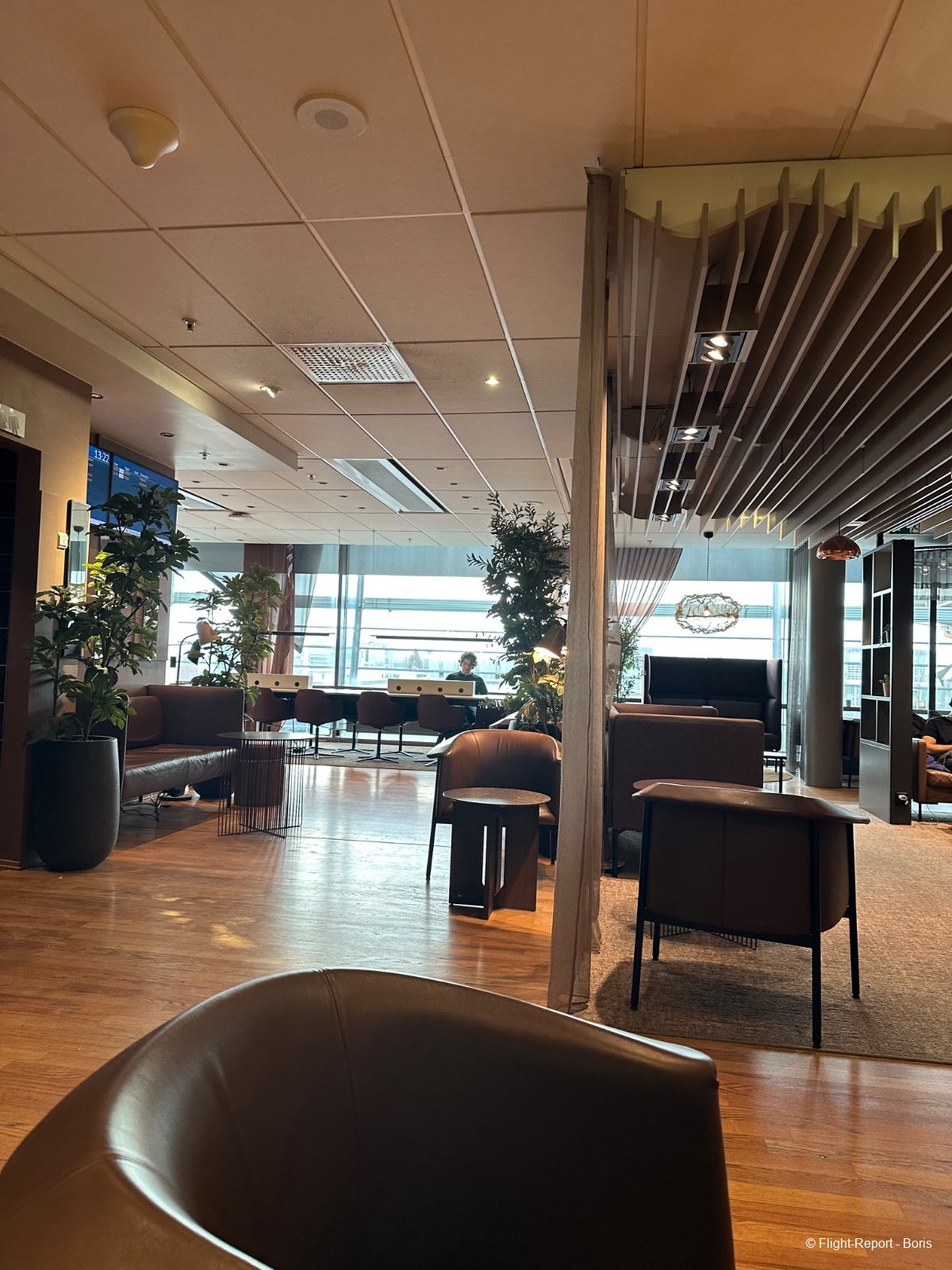 Le lounge est agréable et calme, même s’il n’offre pas de vue particulièrement intéressante sur le tarmac : d’un côté, on aperçoit le hall d’embarquement, de l’autre, le bout de l’aérogare. Un espace réunion est également disponible pour ceux qui souhaitent travailler au calme.