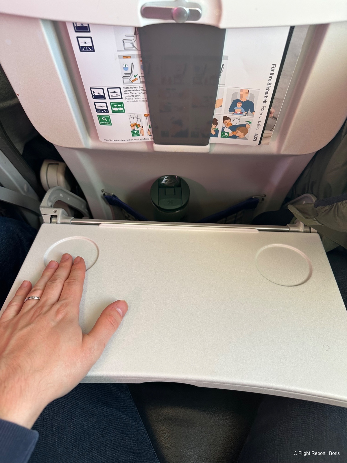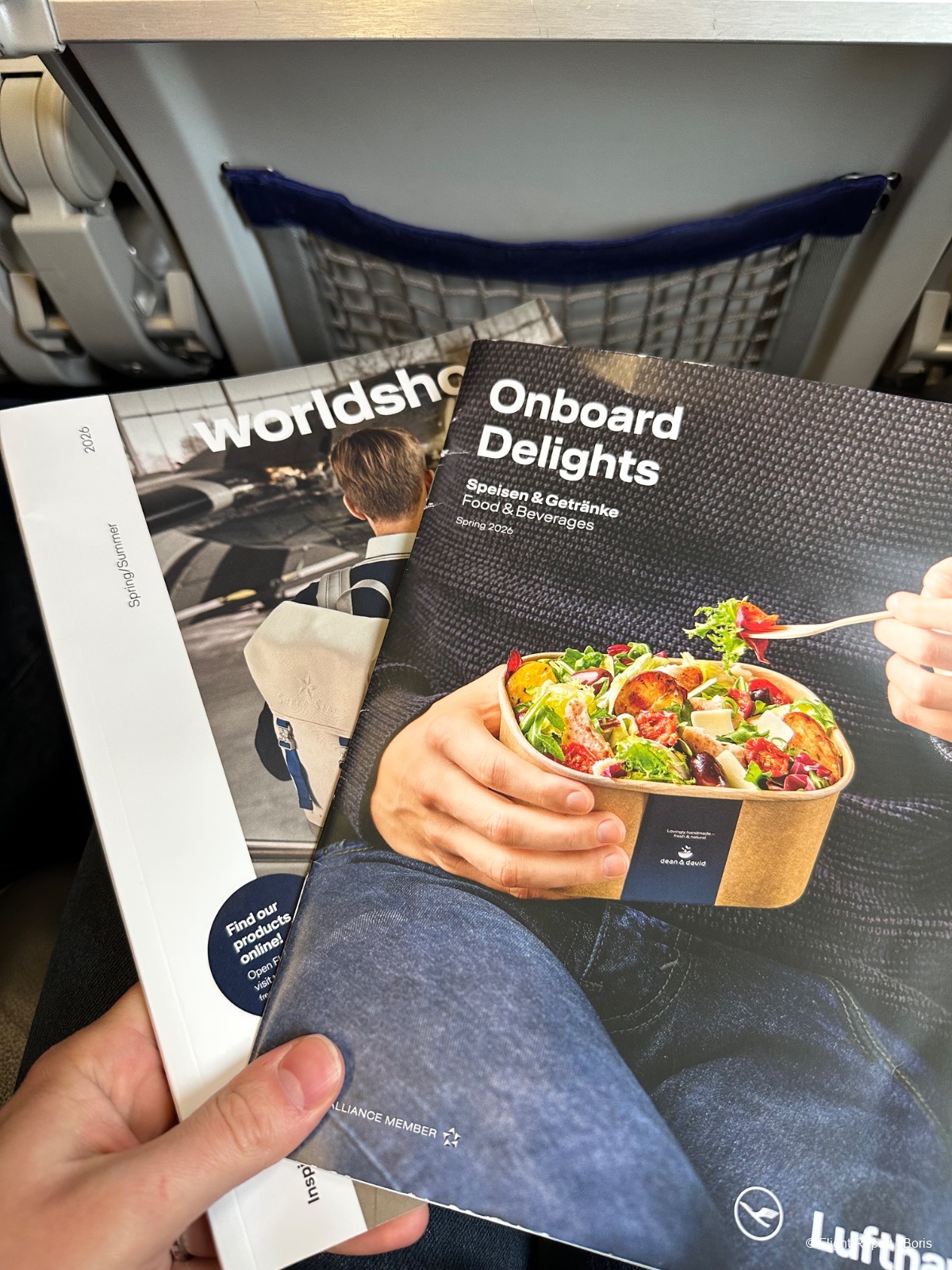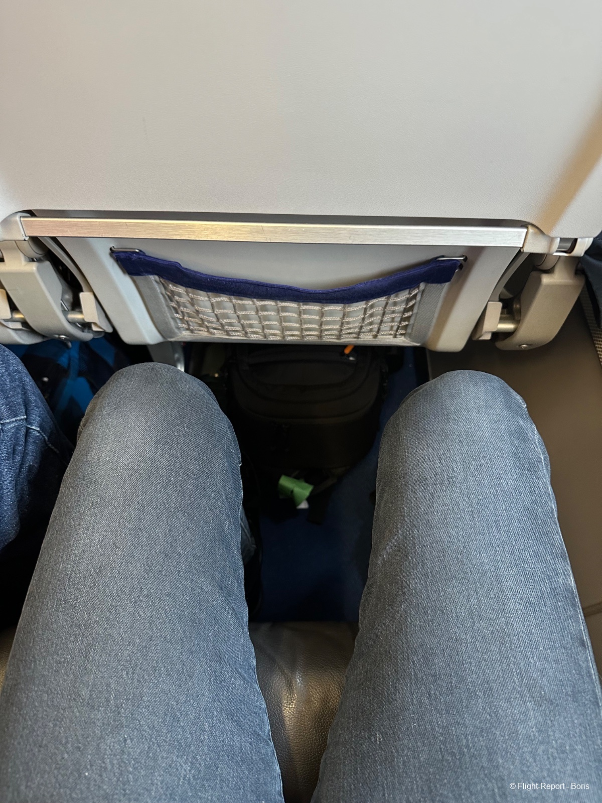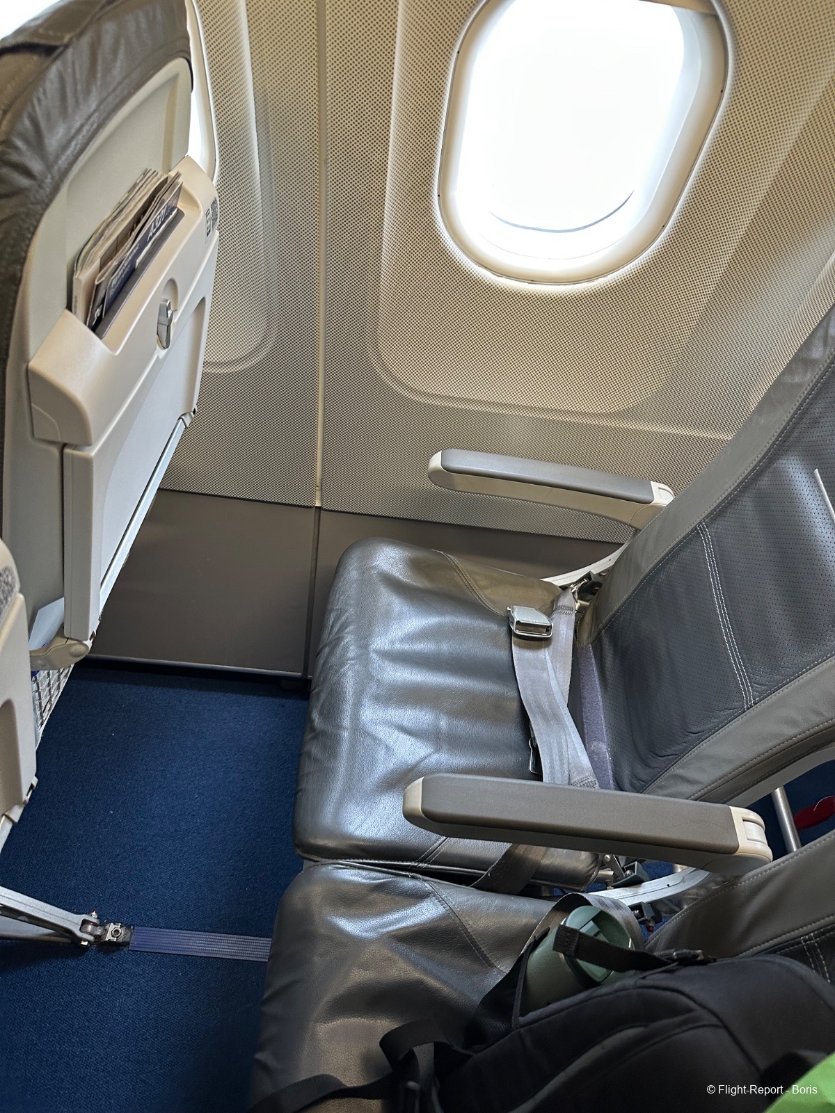Direction ma place, la 31F, côté hublot bien sûr. L’espace pour les jambes est très correct. Dans la pochette du siège, on retrouve la safety card, le magazine WorldShop ainsi que la carte des snacks disponibles à bord.