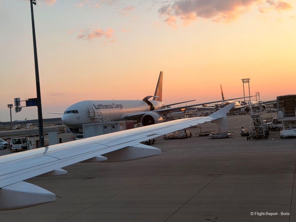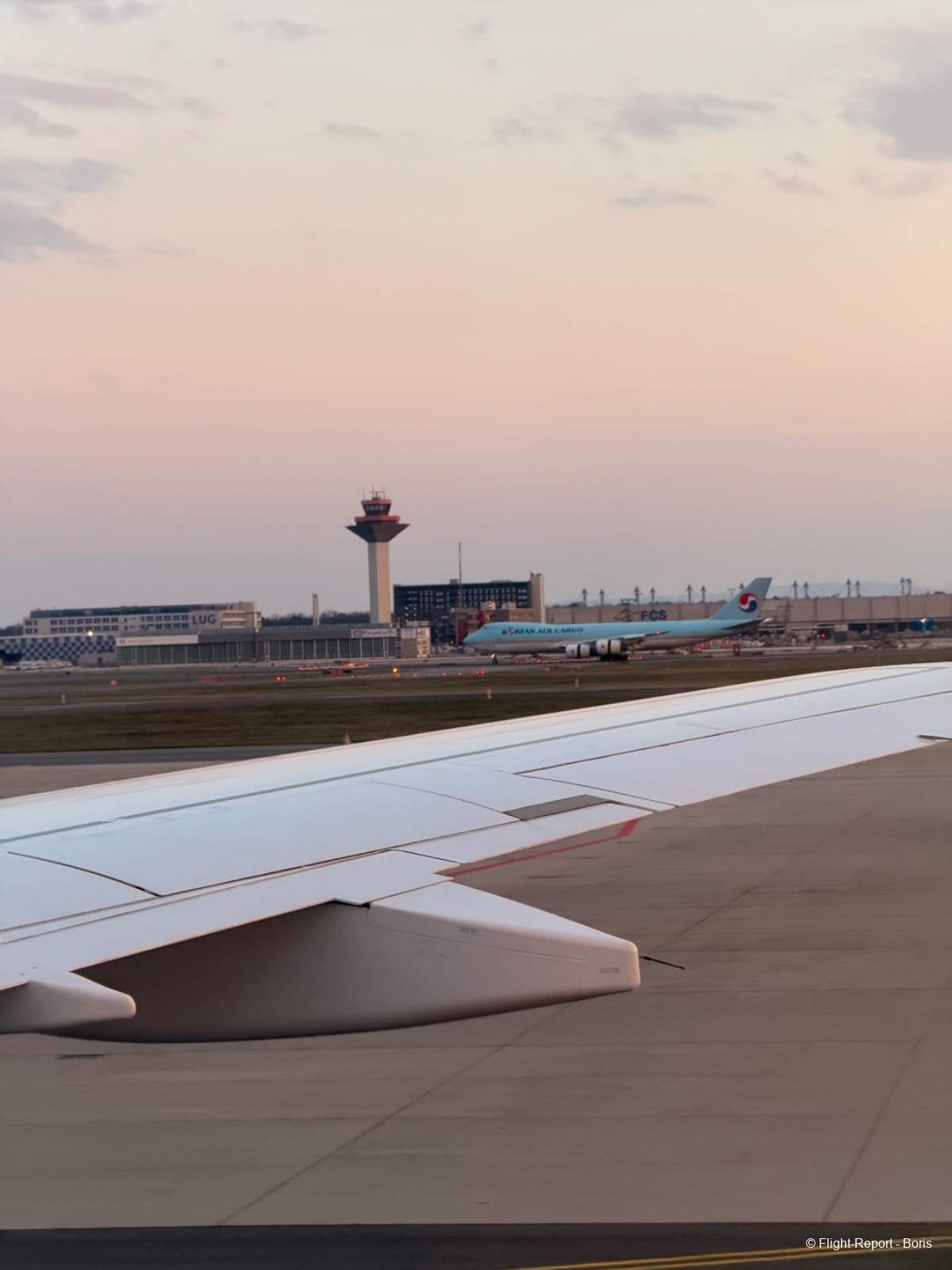 Durant le roulage, nous profitons de la vue depuis le hublot pour faire un peu de spotting. Plusieurs Boeing 747 sont dans les parages. Nous passons la zone cargo, où l’on aperçoit des appareils de Lufthansa Cargo. Cerise sur le gâteau, un 747 de Korean Air vient d’atterrir.