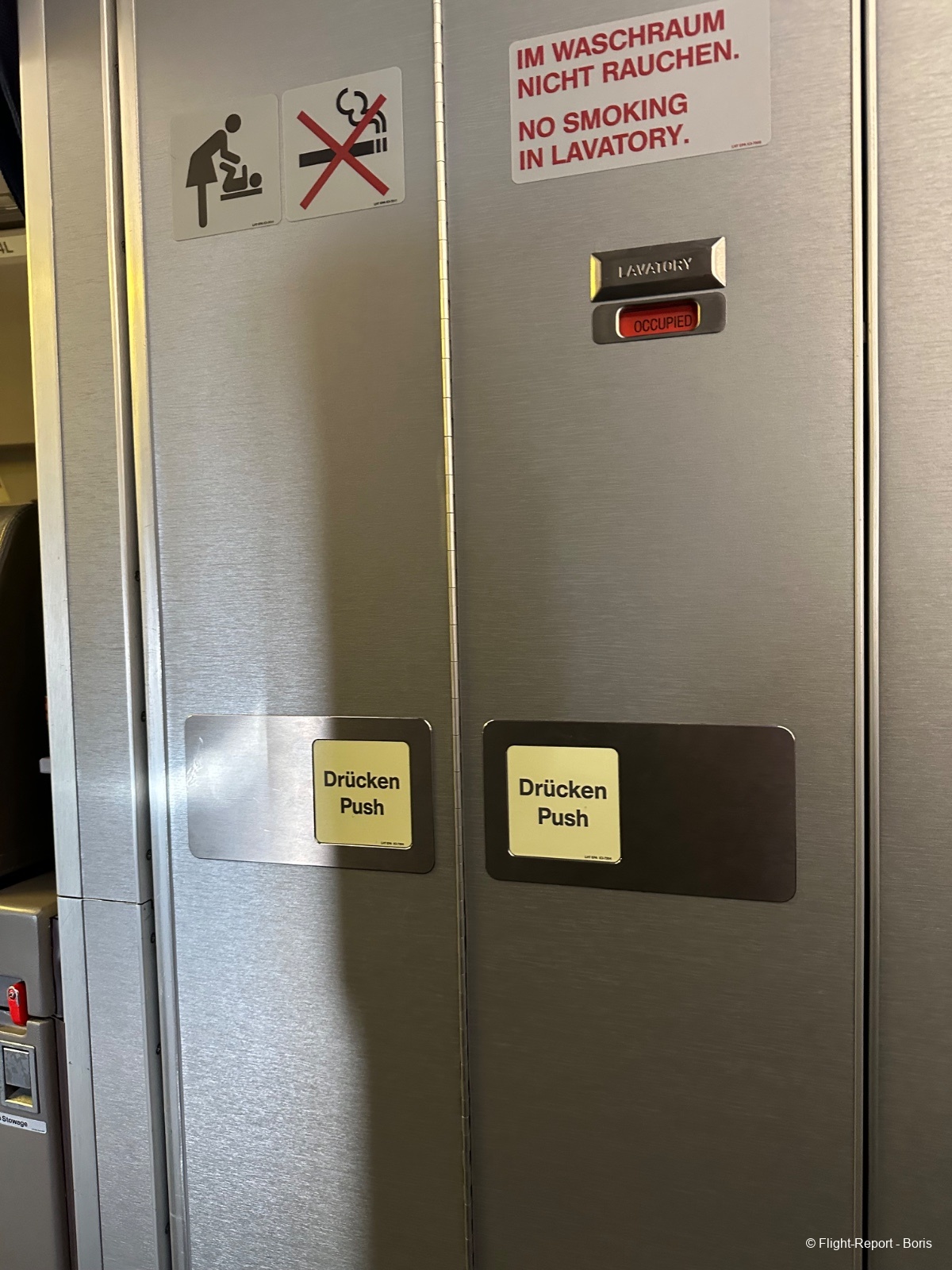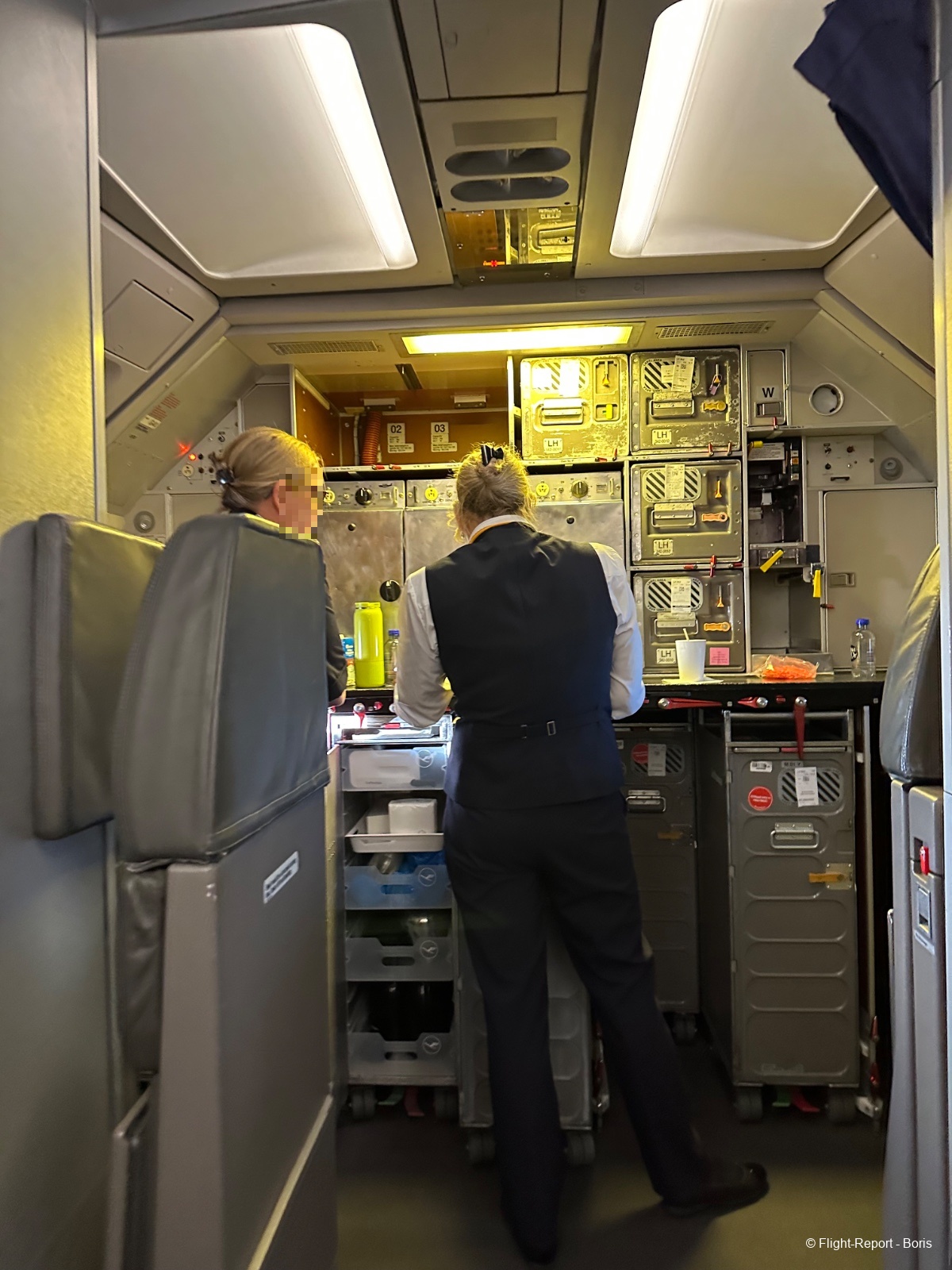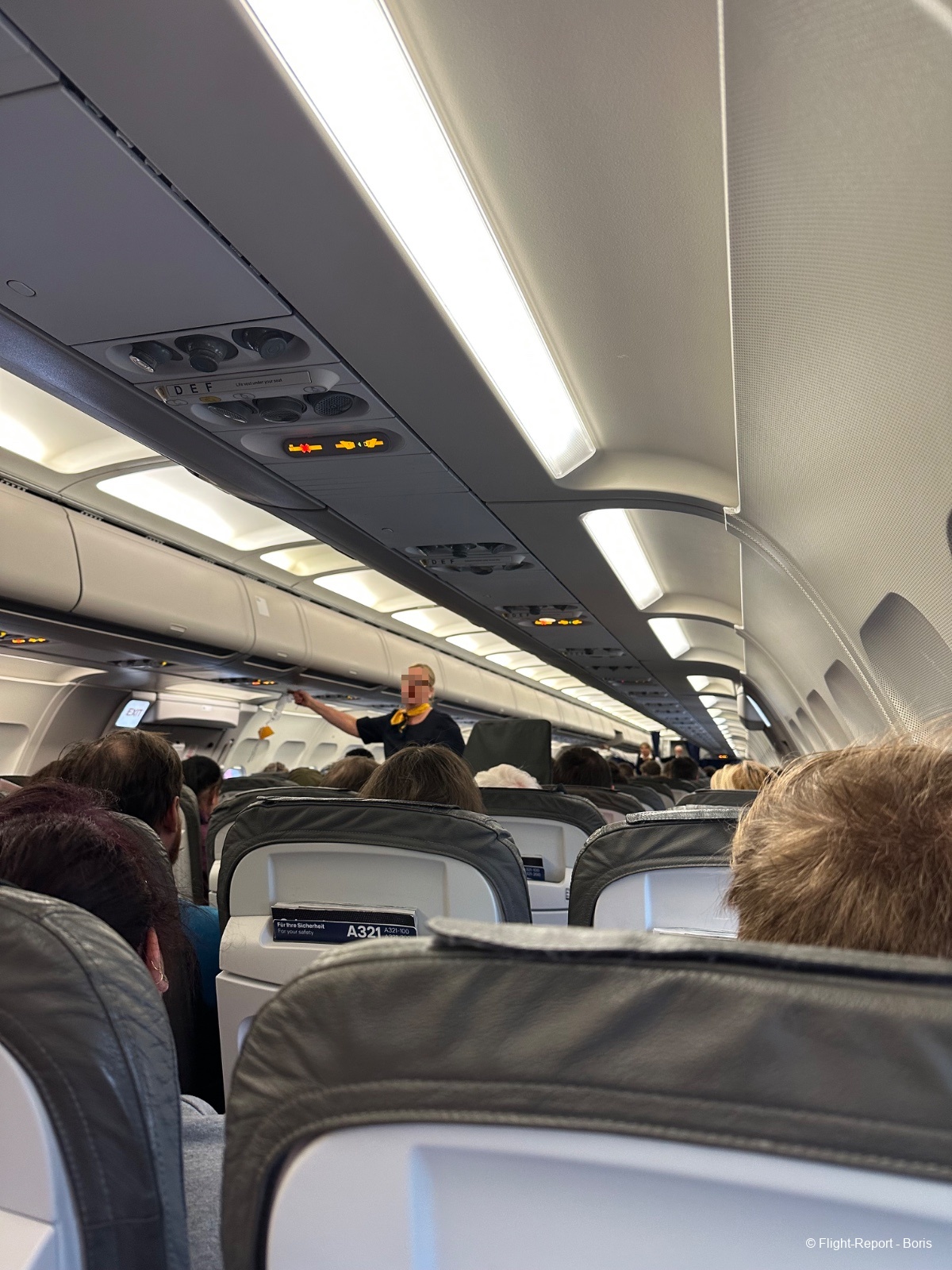 L’embarquement se termine, les portes sont fermées, et l’équipage effectue les démonstrations de sécurité à l’ancienne.