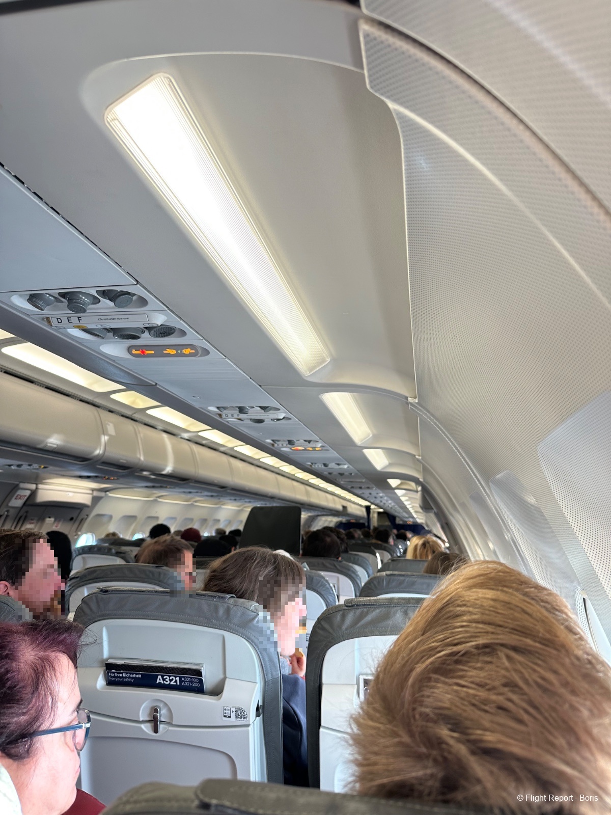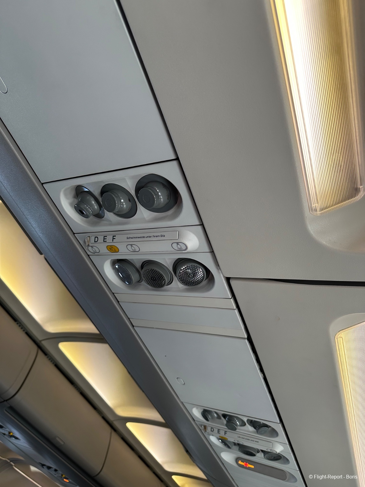 Au niveau du siège, la tablette est de taille convenable pour ce type de vol. Au-dessus de nos têtes, on retrouve la ventilation orientable ainsi que les liseuses individuelles.