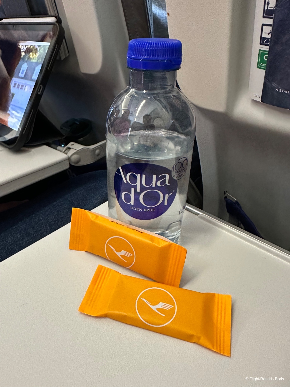 Durant le vol, nous aurons droit à une bouteille d’eau ainsi qu’à un chocolat estampillé Lufthansa.