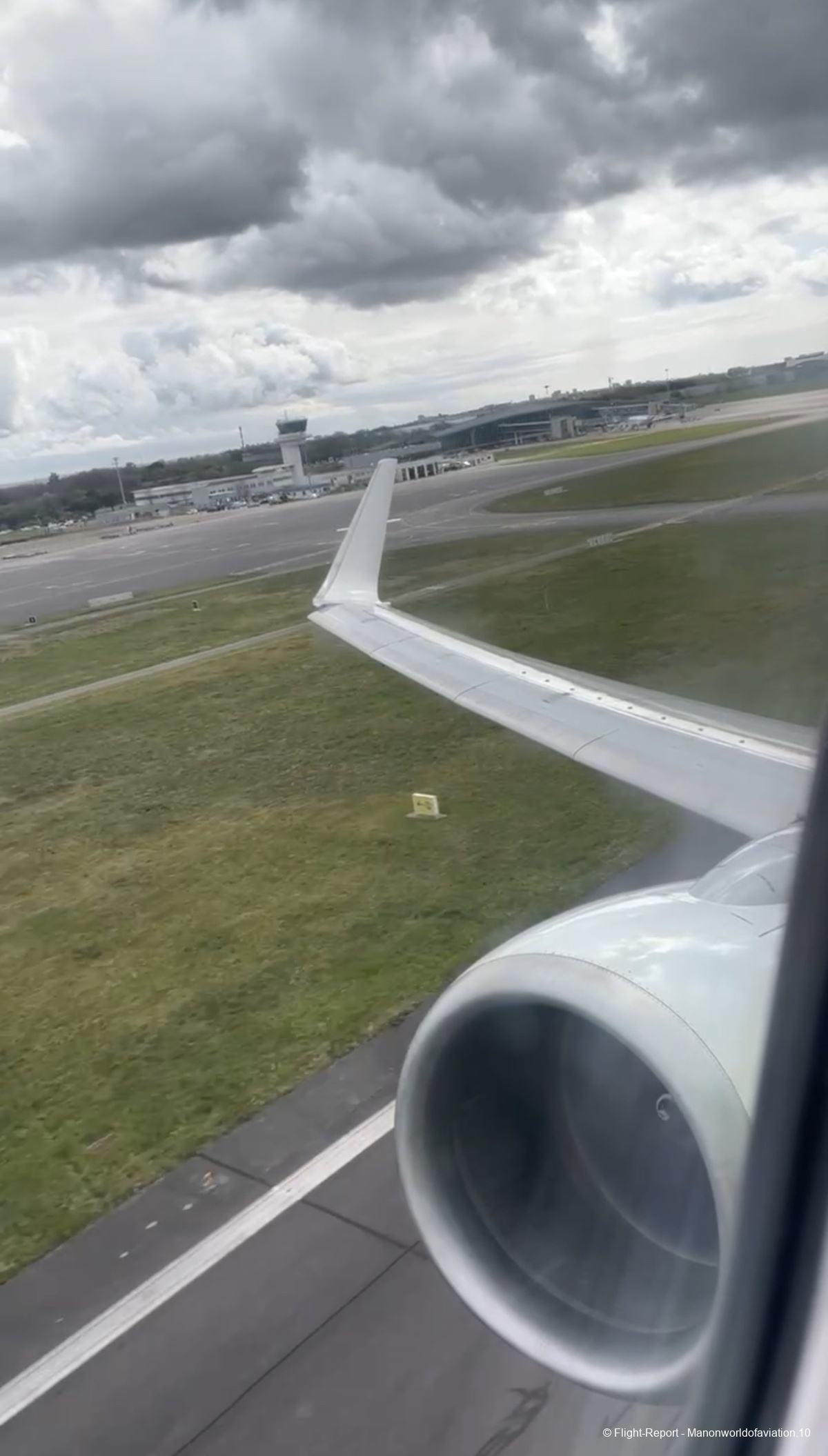16:35, heure de départ, on commence le roulage en douceur avec une petit vue sur la tour de contrôle et l’aérogare !🥰