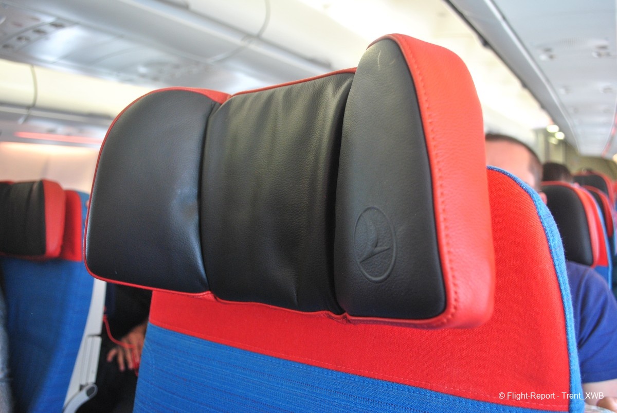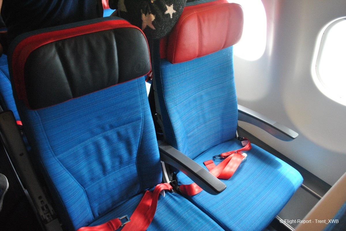 The seat has fabric upholstery with "leather" adjustable headrest, modern IFE with big crispy screen, remote control and USB port, bi-fold tray table, seat pocket and legrest. The row pitch is very good. The downside of the IFE is 2 underseat power boxes: wherease one is quite slim, the other is quite wide and bothersome, reminding an infamous power box in LH B748. Though, as I had the entire duo seat block at my disposal, I was able to comfortably put my legs away from these boxes. Waiting on the seat were pillow and blanket.