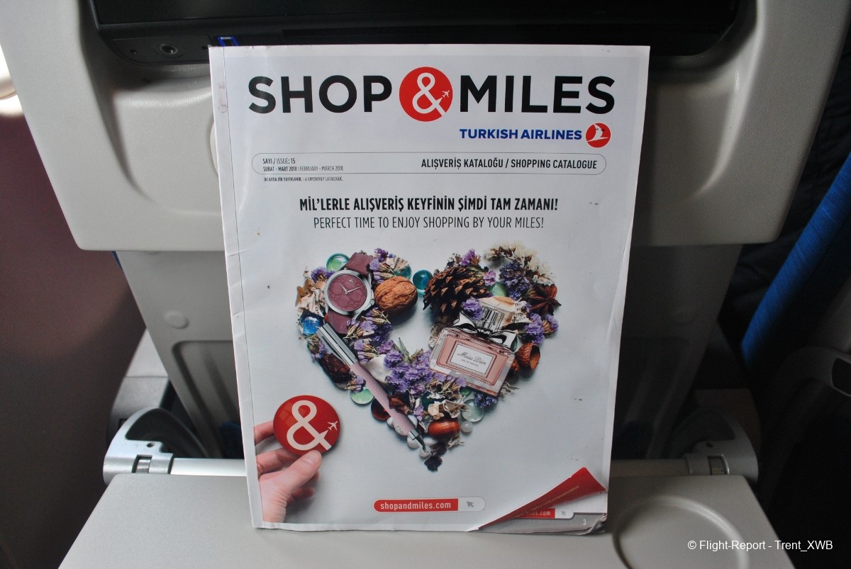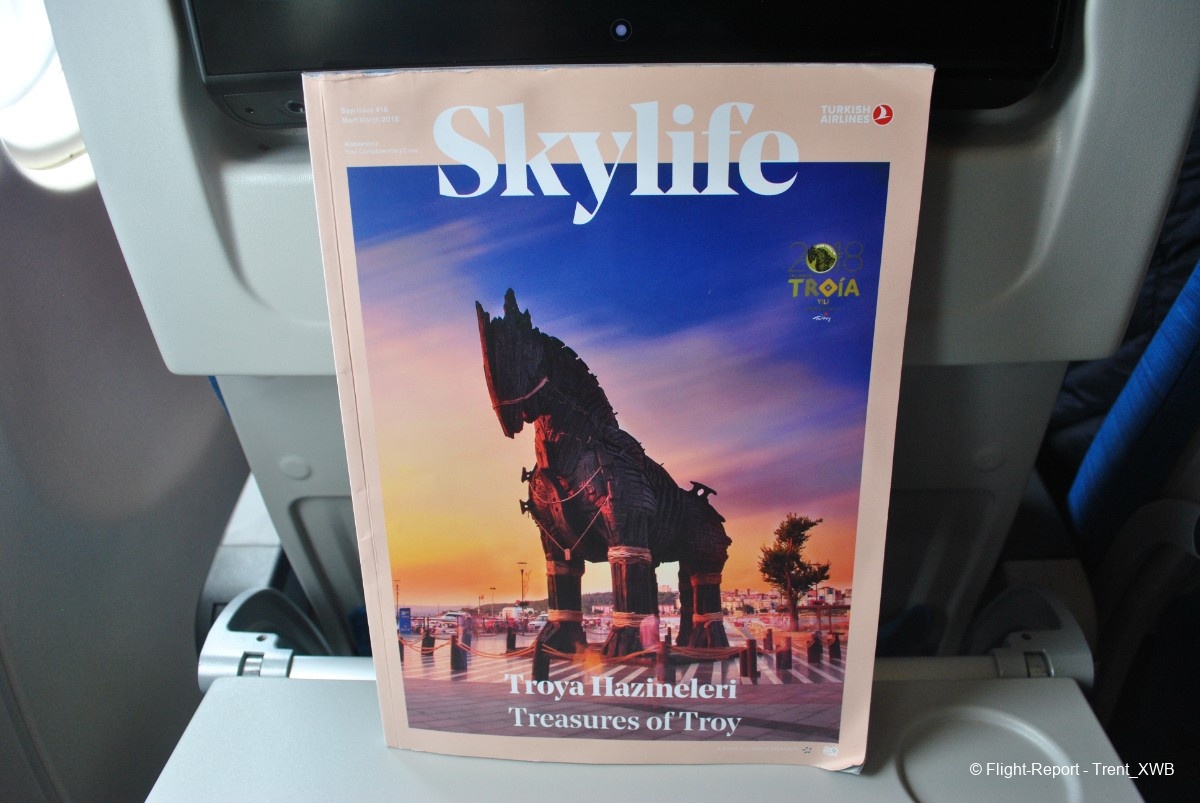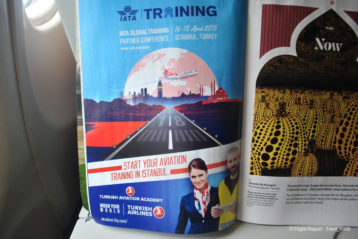 The seatpocket content: safety card, inflight magazine, duty-free magazine and waste bag. Also there was printed menu (will be shown further), which was a signature feature of pre-Covid TK.