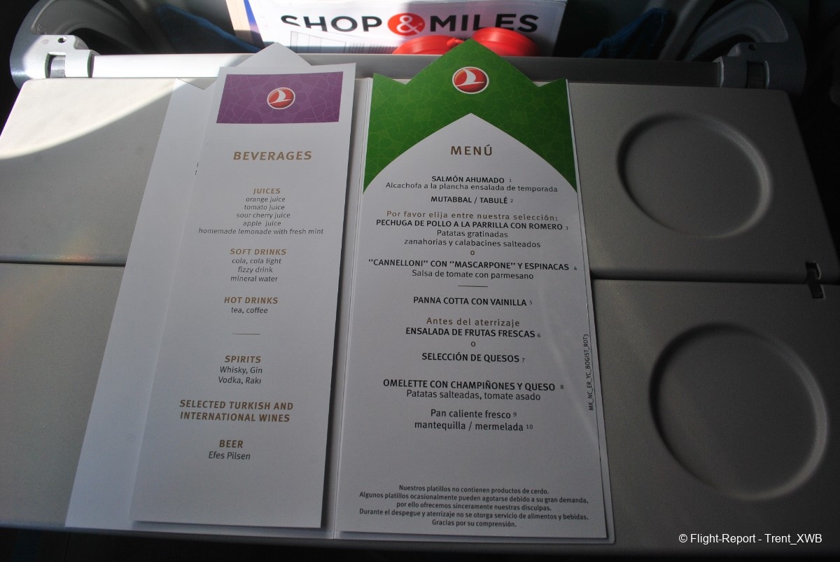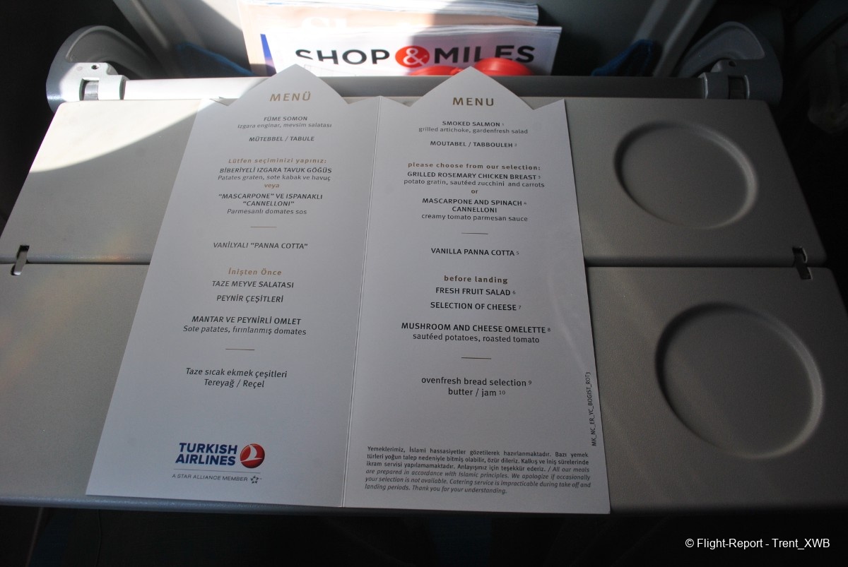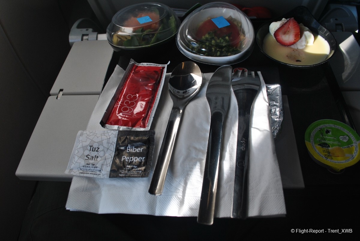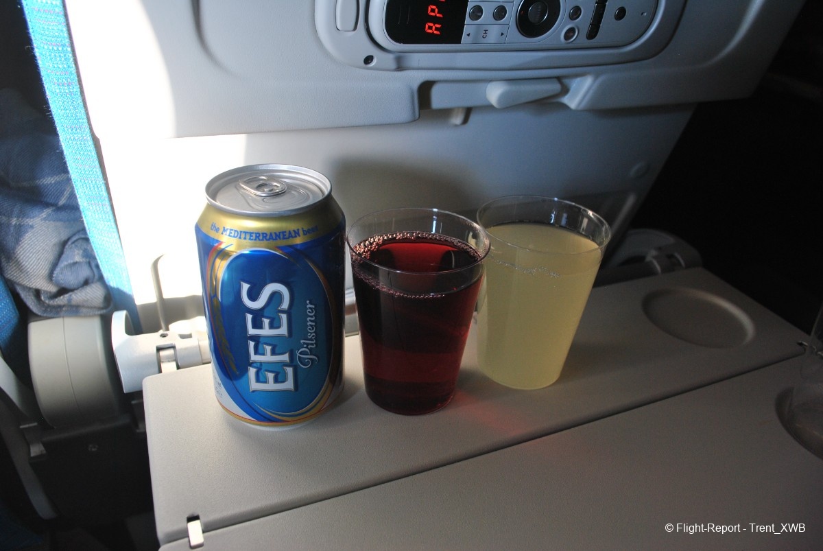 The dinner: grilled rosemary chicken breast with potato gratin, sauteed zucchini and carrots plus smoked salmon with grilled artichoke and gardenfresh salad plus tabbouleh plus vanilla panna cota. Everything was tasty. The cutlery was metallic, as usual on TK flights. For the drinking I chose TK's signature lemonade, cherry juice and Efes beer.