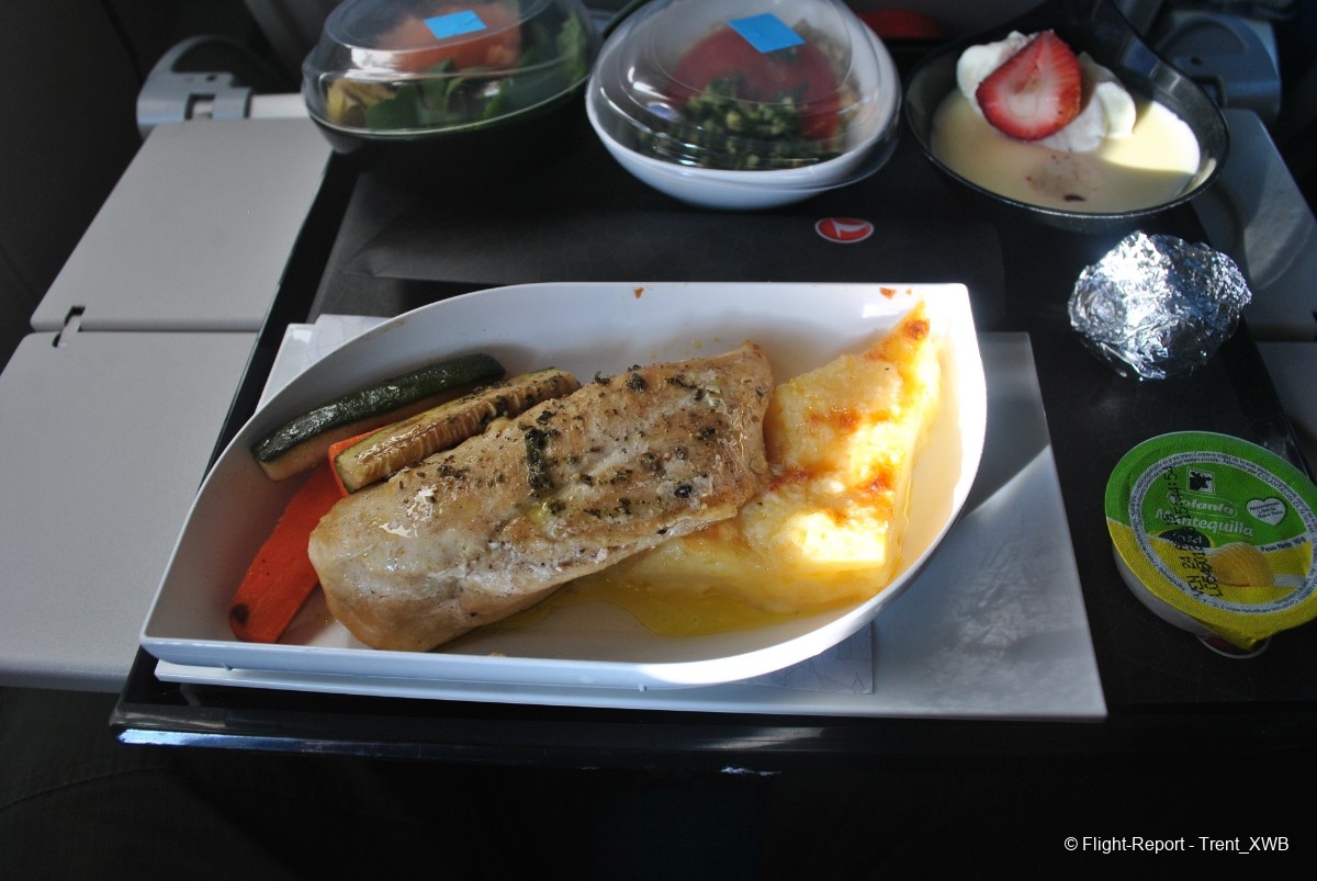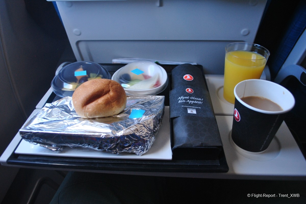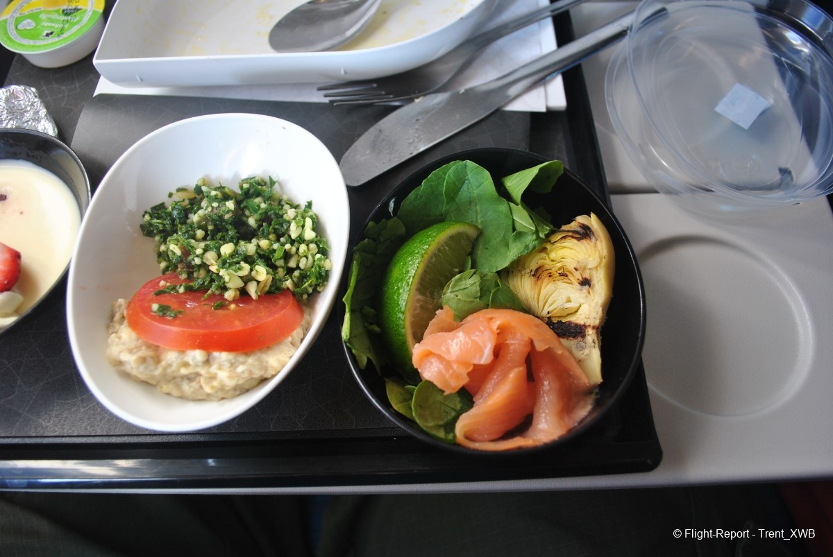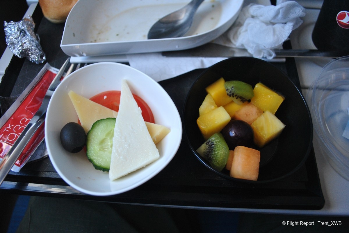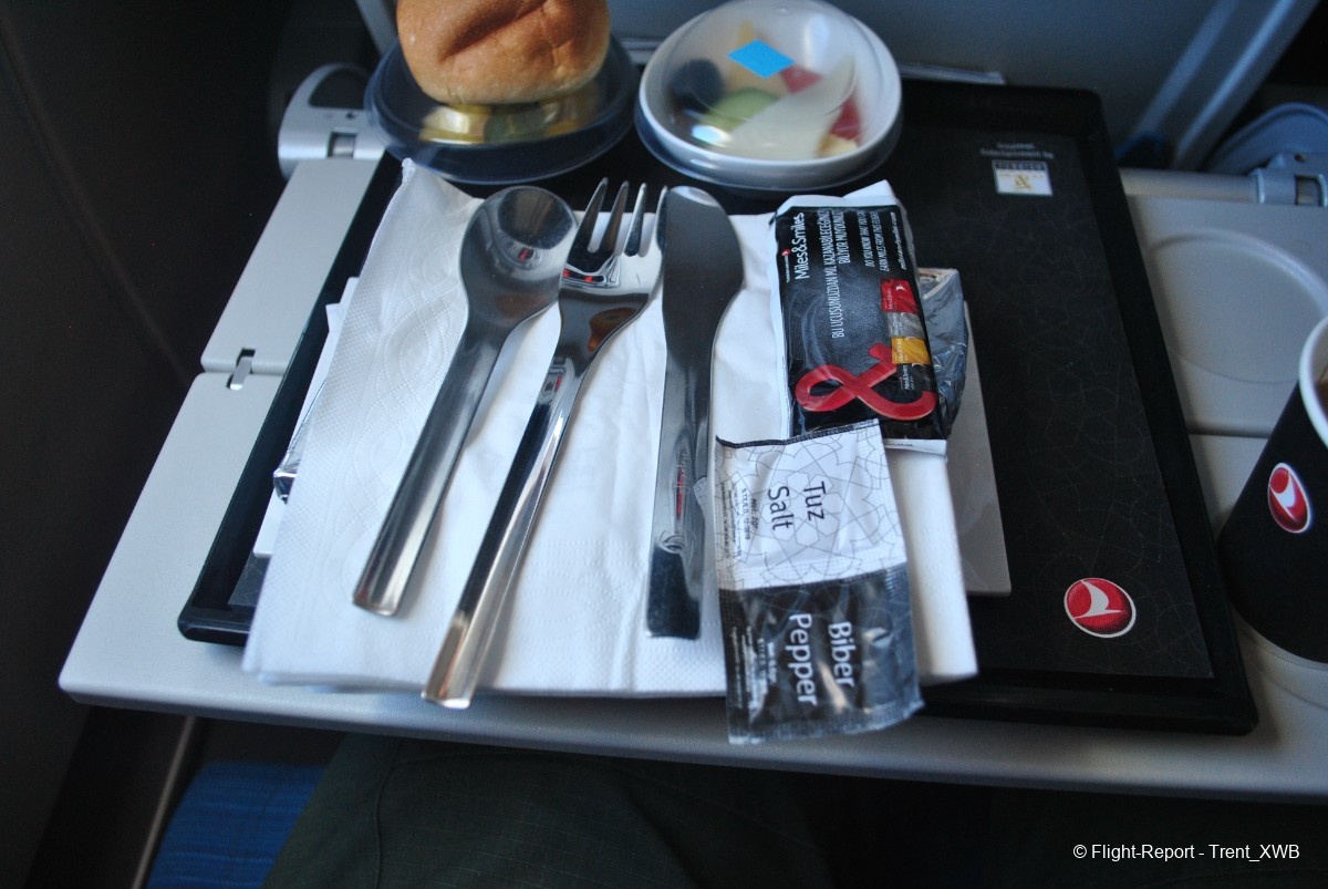 The dinner: grilled rosemary chicken breast with potato gratin, sauteed zucchini and carrots plus smoked salmon with grilled artichoke and gardenfresh salad plus tabbouleh plus vanilla panna cota. Everything was tasty. The cutlery was metallic, as usual on TK flights. For the drinking I chose TK's signature lemonade, cherry juice and Efes beer.