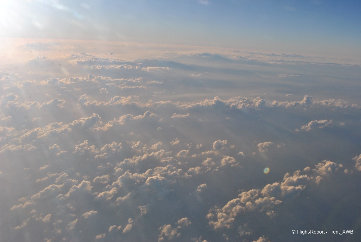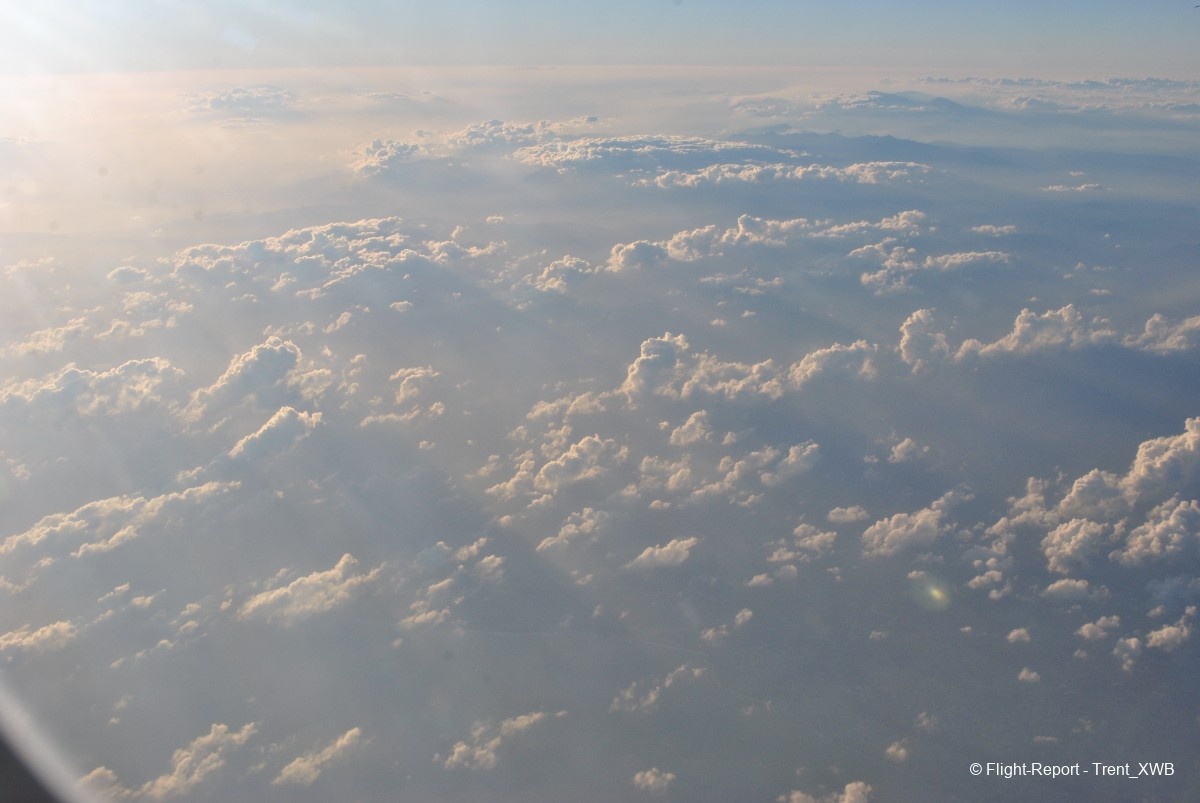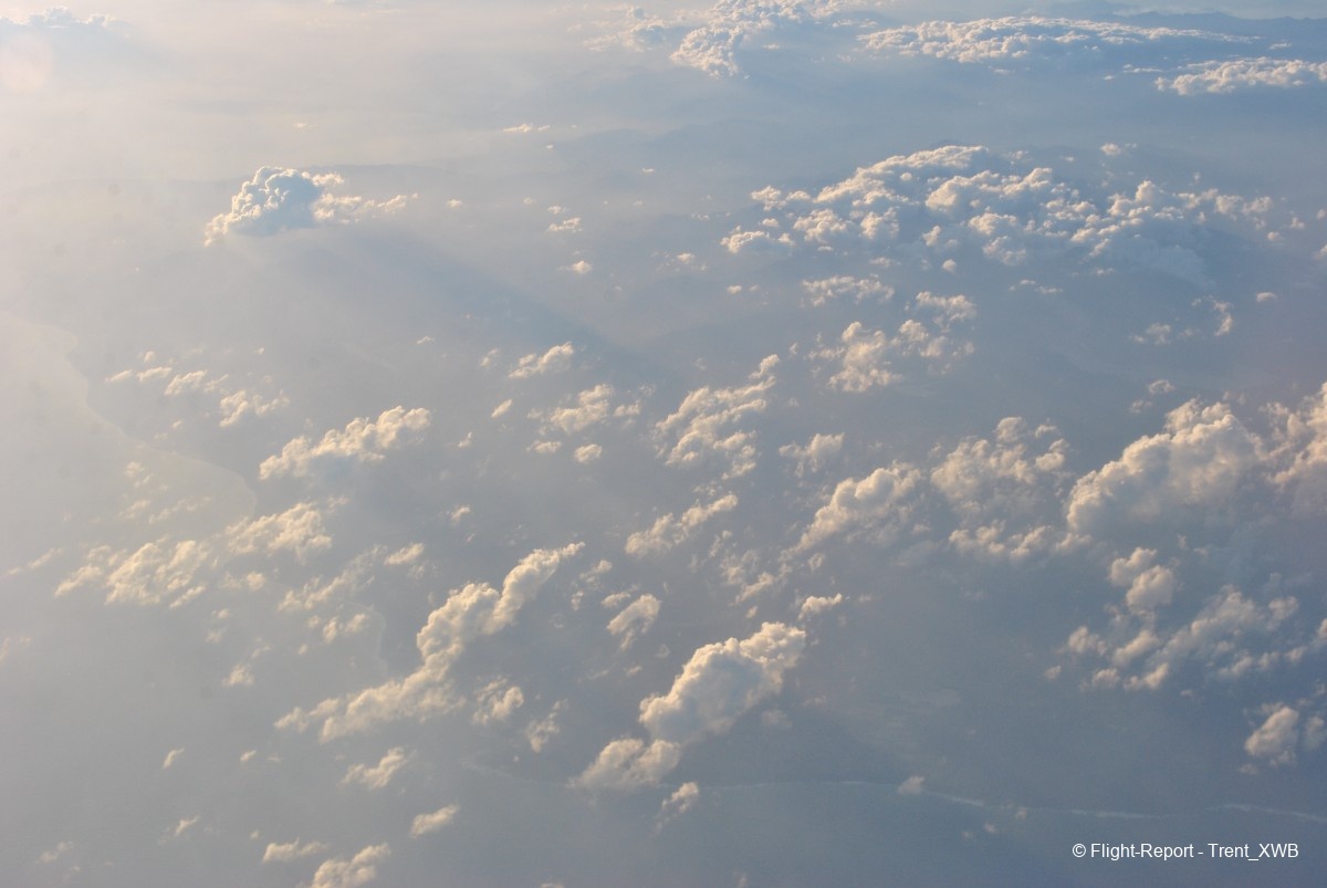 Meanwhile we're flying over the Caribbean Sea with beautiful cloud formations, lightened by the evening sun.