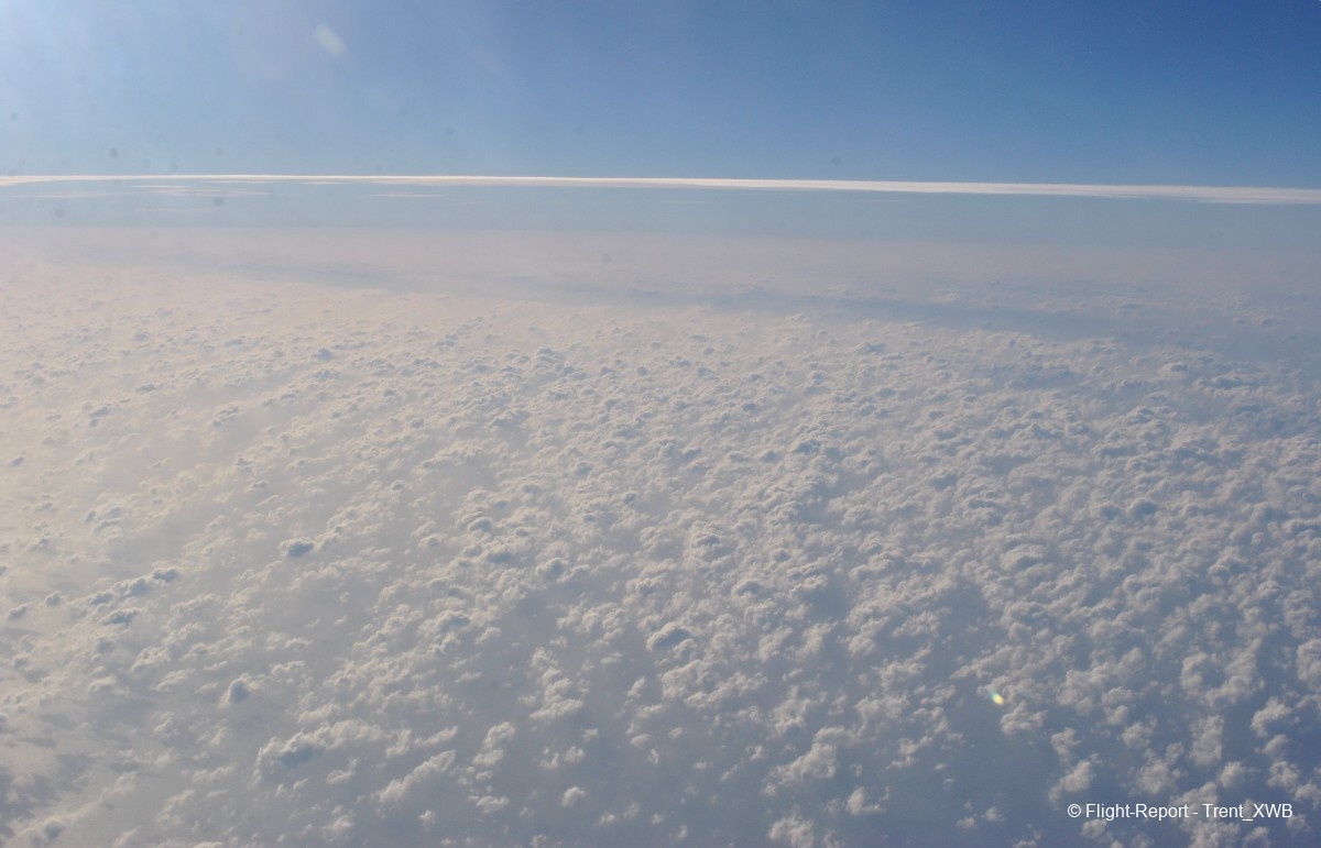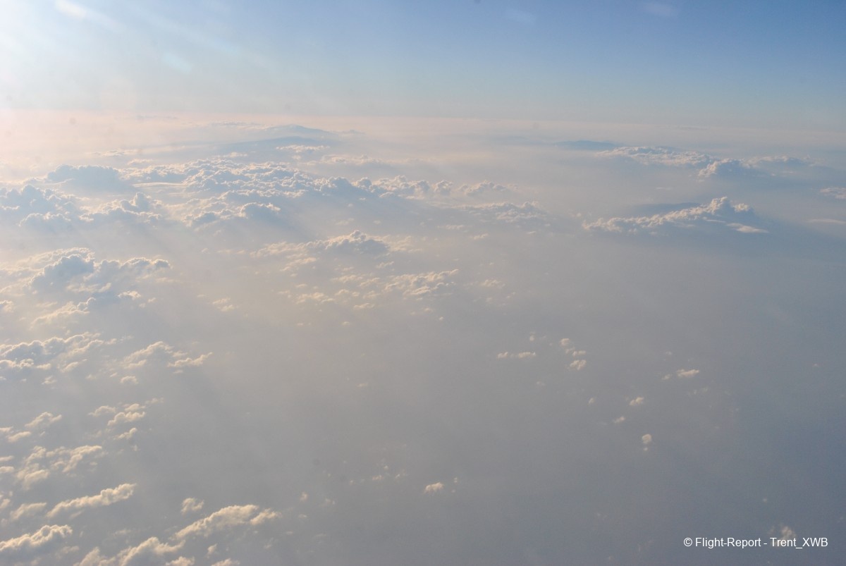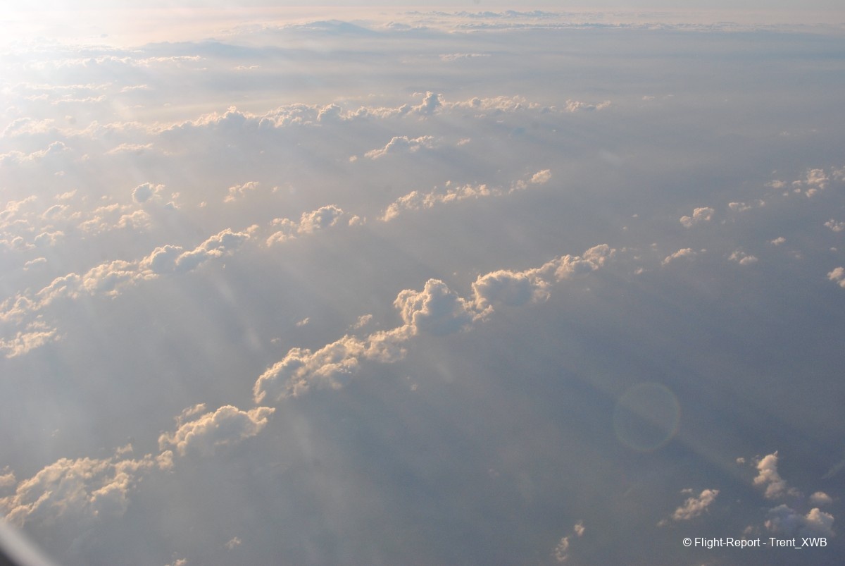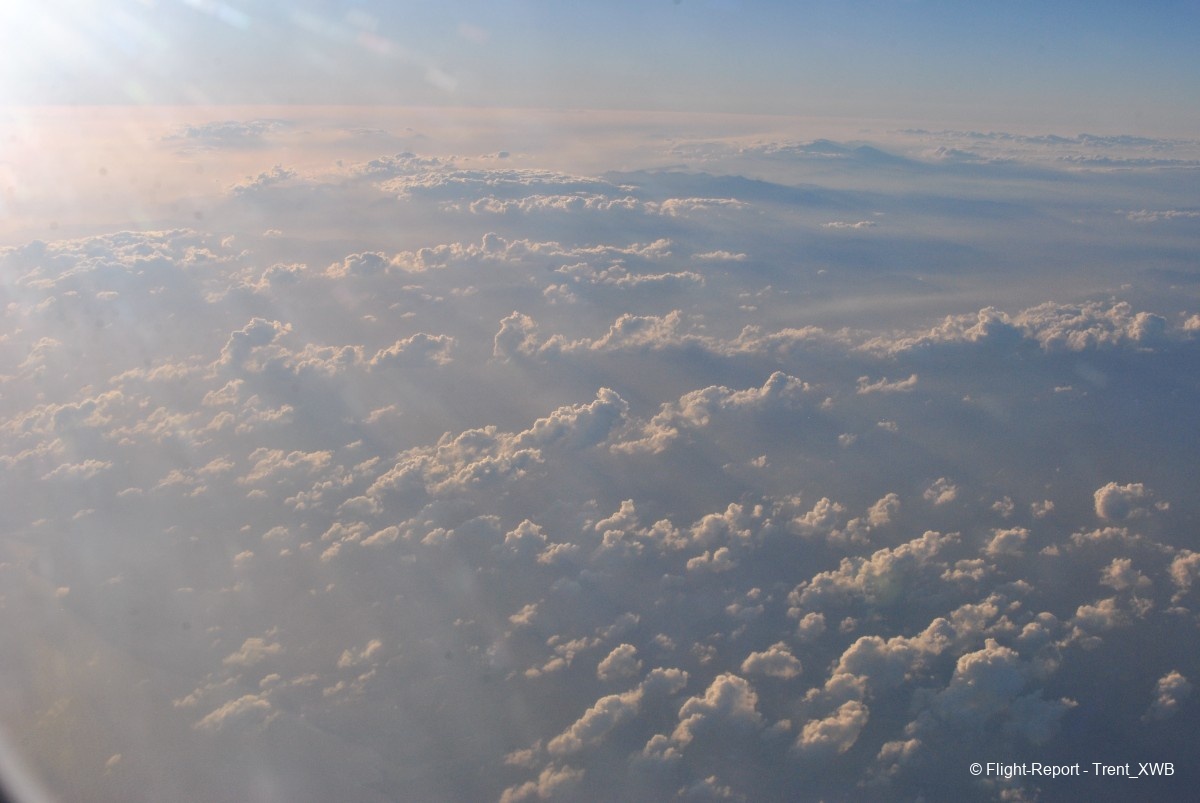 Meanwhile we're flying over the Caribbean Sea with beautiful cloud formations, lightened by the evening sun.