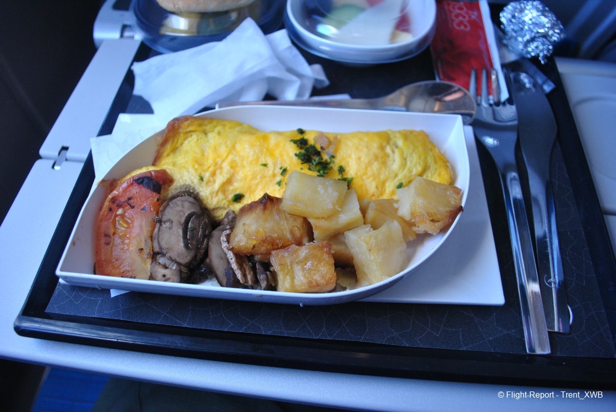 As the flight is not full, there's a good chance to get an additional meal, and the crew hand me the 2nd option: mascarpone and spinach canneloni with creamy tomato parmesan sauce. After this bonus I was completely filled and decided to sleep, as it got completely dark outside.