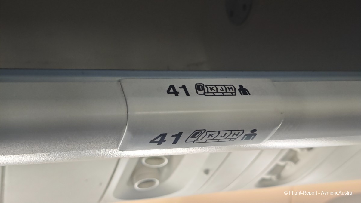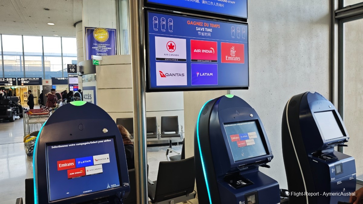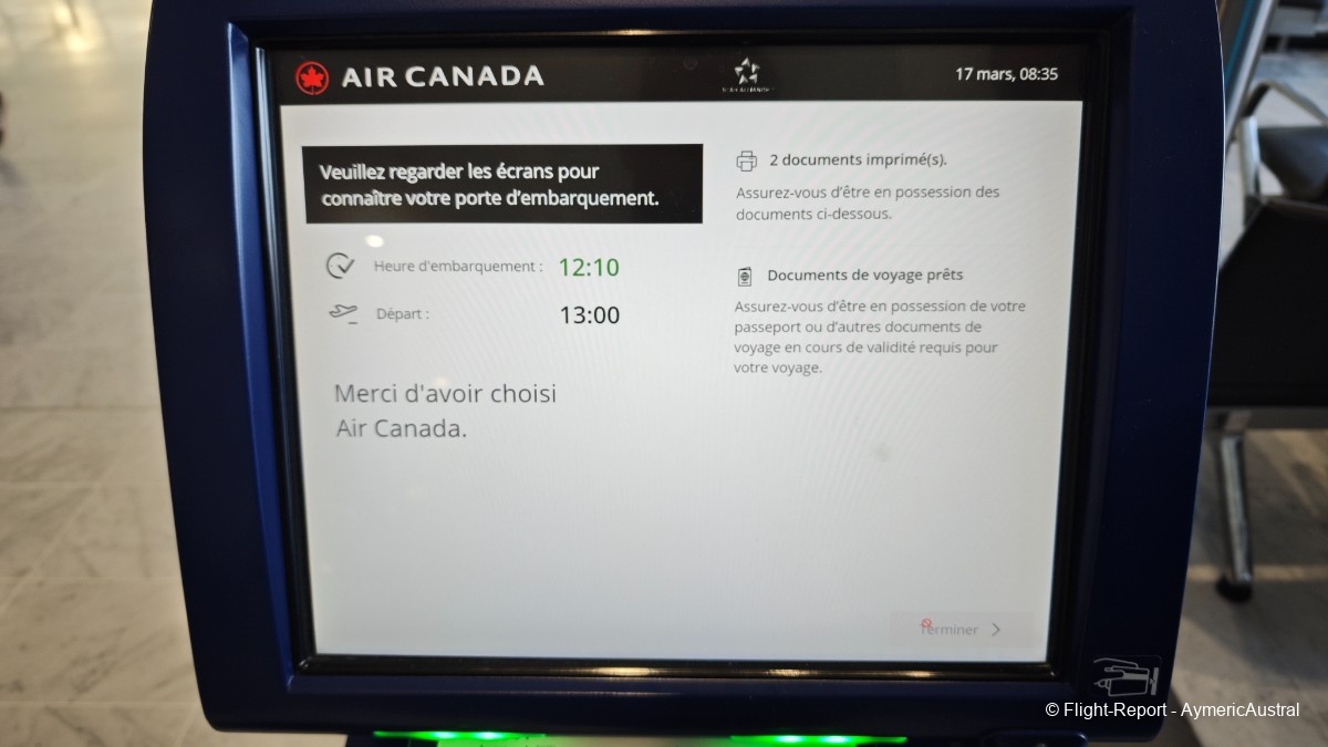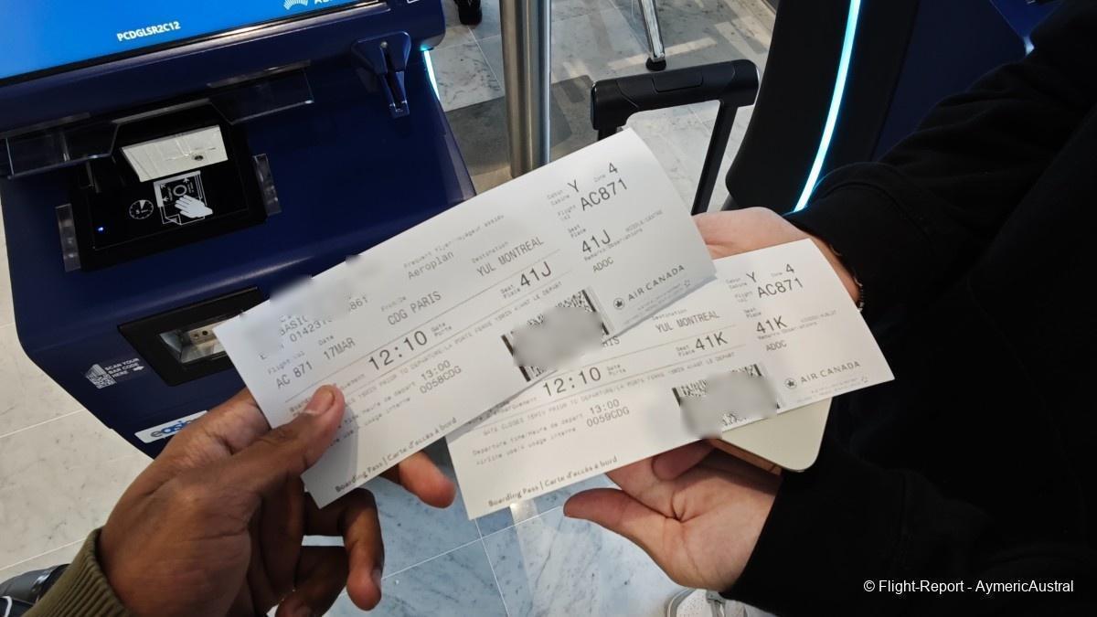 Ayant déjà fait l'enregistrement en ligne, on passera directement sur la borne pour récupérer un billet papier, cela ne prendra pas plus de 2min. On sera assis en place 41J/K
