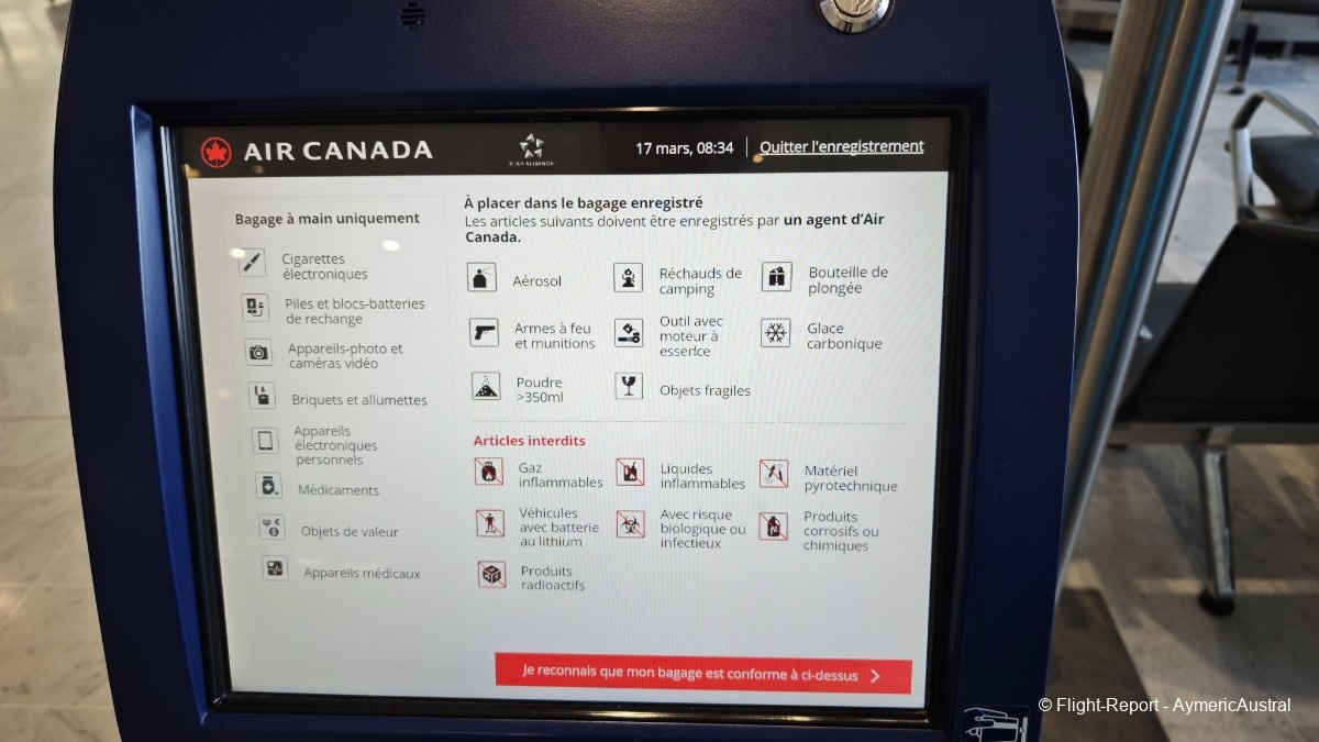 Voilà la zone d'enregistrement AC, qui possède un enregistrement continue pour les vols au départ de YUL et YYZ, des bornes sont également mis a disposition pour ce qui se sont enregistrées en ligne