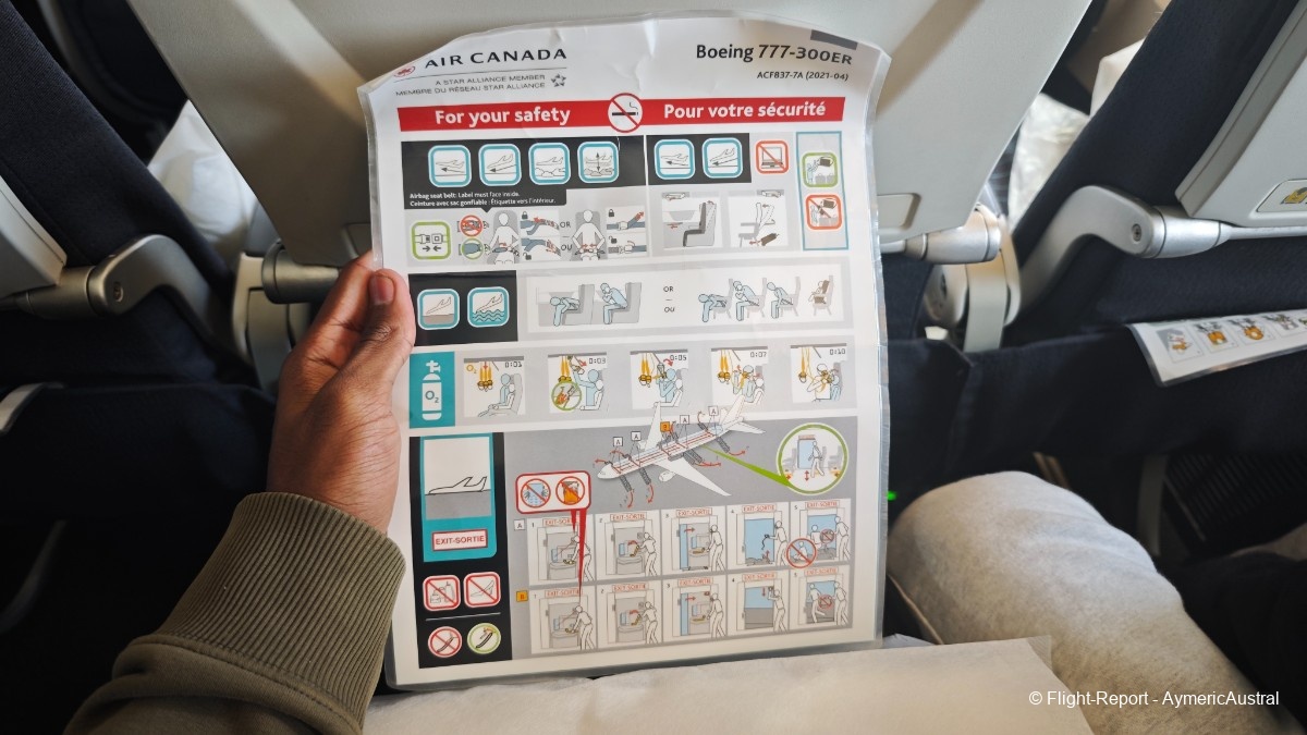 Voilà nos sièges pour ce vol, le 41J/K, Un hublot bien centré pour ce vol. Le pas avec le siège avant est top, meilleur que les divers 777 que j'ai plus prendre jusqu'ici. La tablette est grande, la safety card, qui a du vécu… L'armement pour ce vol se compose d'un oreiller blanc avec une couverture signé air canada