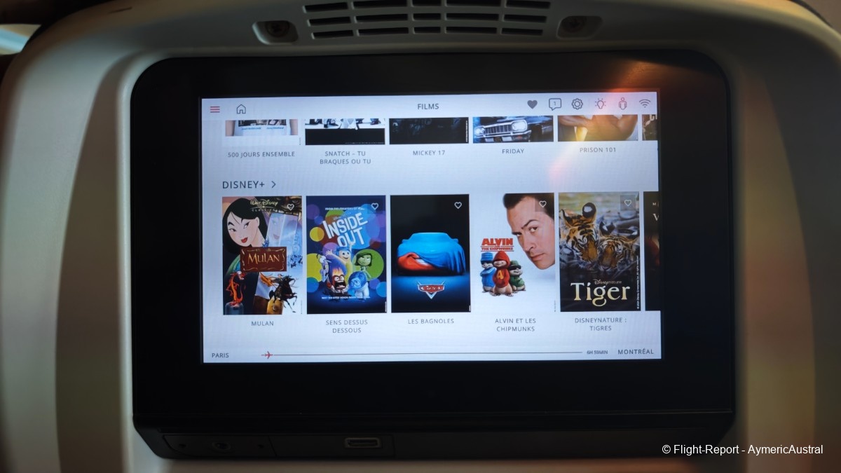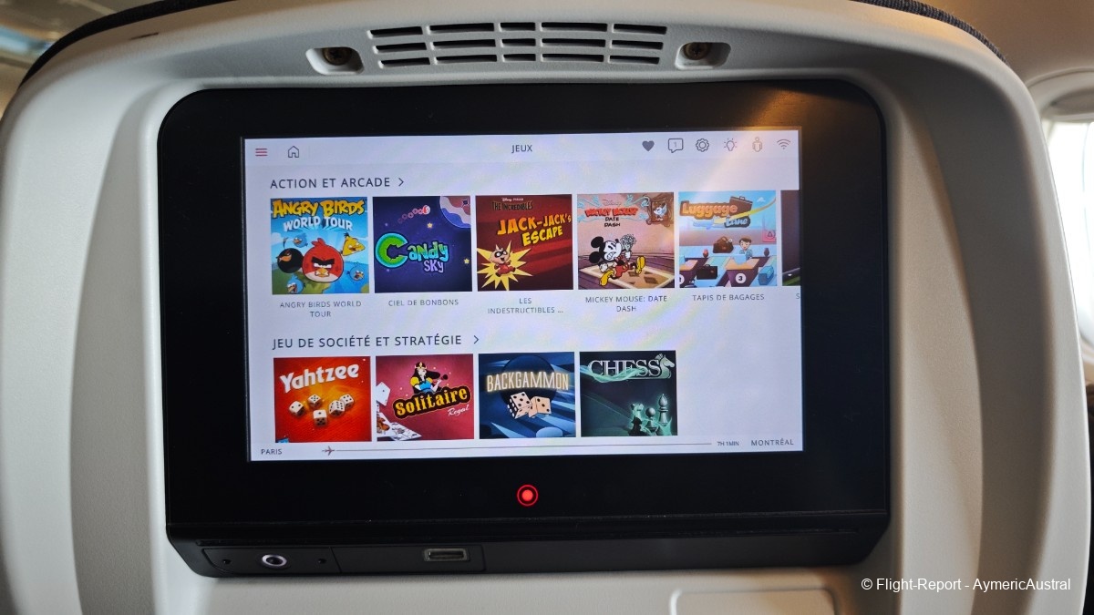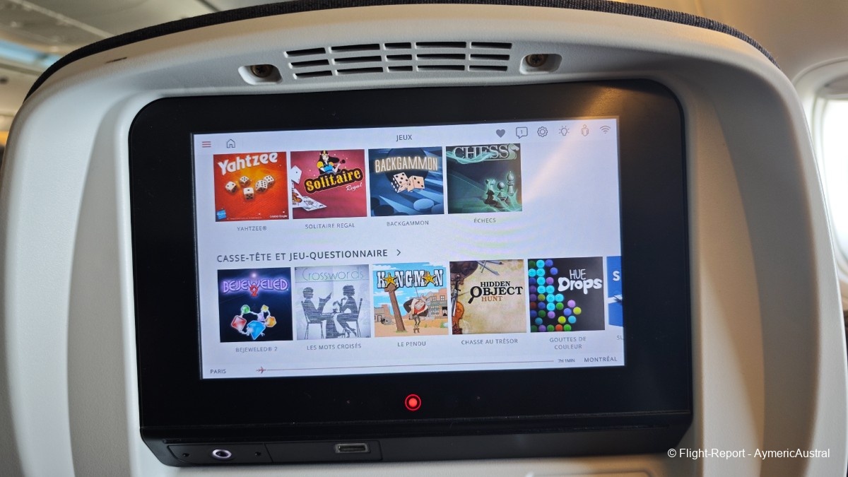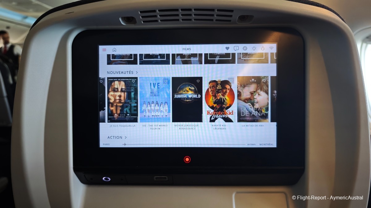Parlons un peu de l'IFE ! Air Canada propose des IFE de 8,9", ce qui reste correct, l'écran est fluide, l'interface est plutôt bien organisé. Ensuite le divertissement, la compagnie propose un catalogue énorme concernant les jeux, films, série, musique. On trouve de tout, pour tout les âges, avec des sortie ancienne, récente, des trilogie de films etc… Peut être même qu'il y en a beaucoup trop et qu'au final on ne sait plus où regarder, ou quoi regarder tellement il y a de choix.