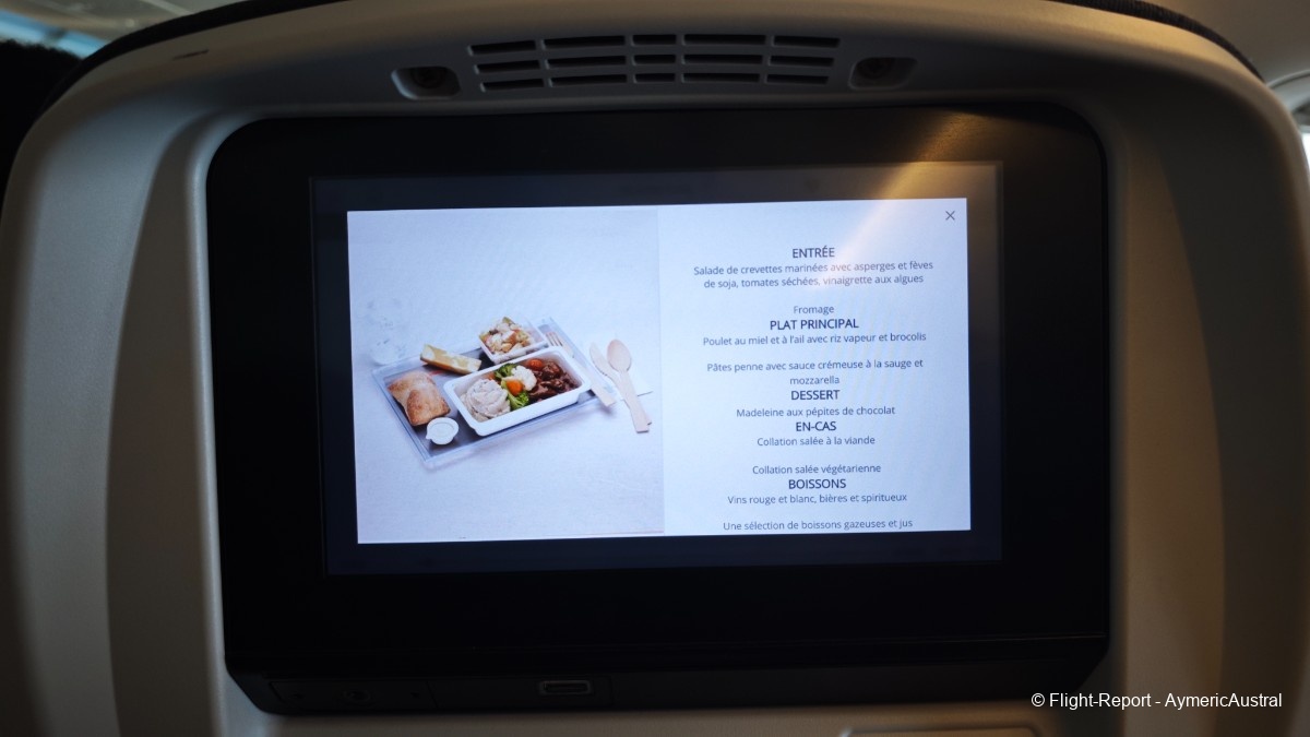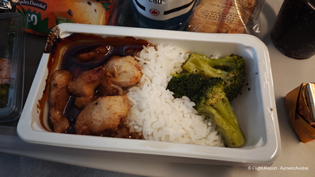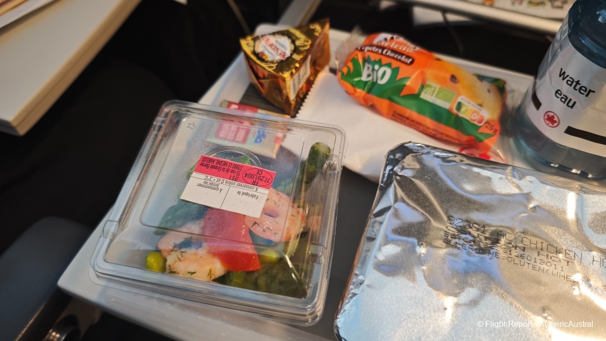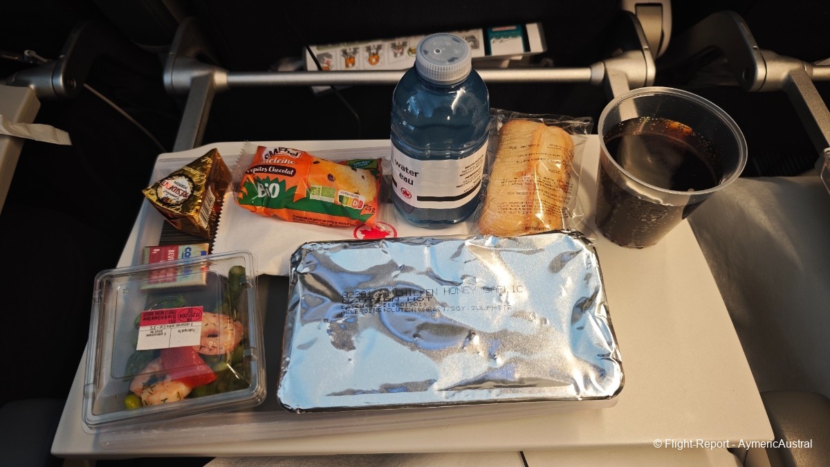 Une heure après le décollage, le service repas débute. Au menu nous auront une salade de crevettes en entrée. Pour le plat nous aurons 2 choix : Poulet au miel avec du riz ou alors Pâtes penne avec sauce crémeuse, pour nous 2 ça sera poulet au miel. En dessert une Madeleine aux petite de chocolat, chose qui e je ne qualifierais pas vraiment de dessert… Mais l'ensemble est plutôt satisfaisant même si la portion paraît petit…