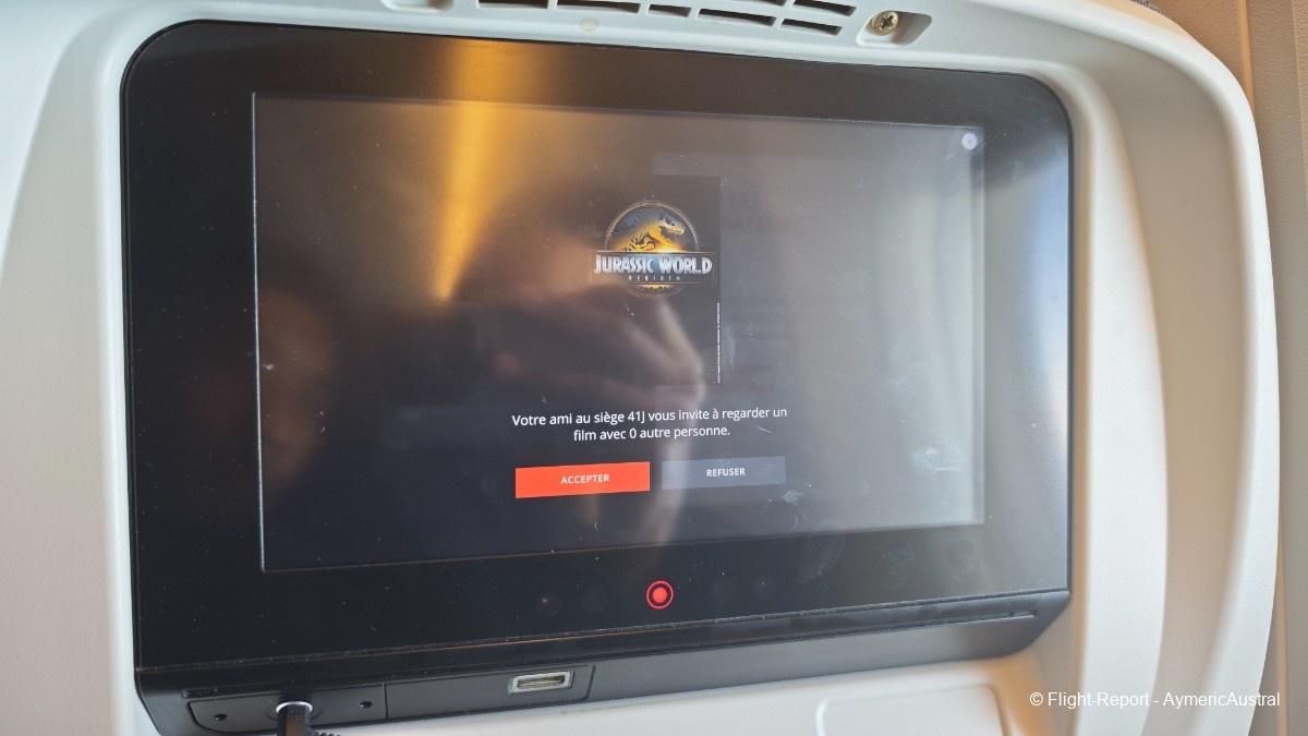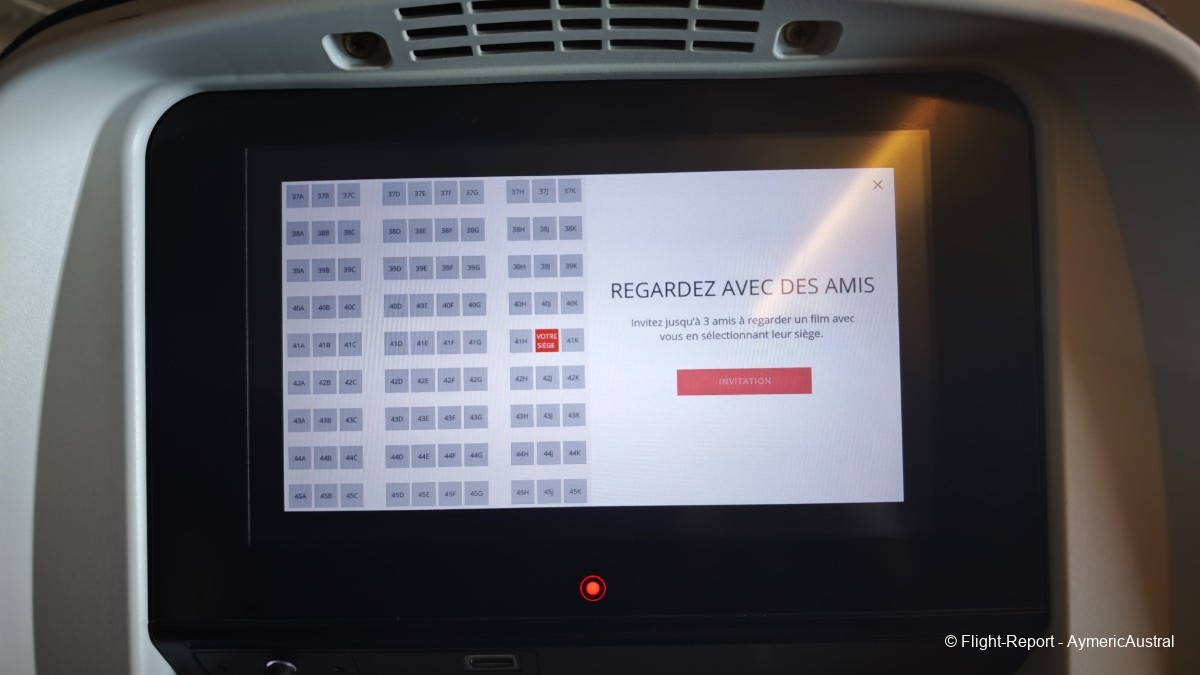 On va commencer par regarder un film pour cette première partie du vol, et voilà que air Canada propose une option plutôt intéressante qui est la possibilité de regarder un film avec des personnes, il suffit juste de sélectionner le siège de la personne avec qui regarder, et celui ci recevra une invitation