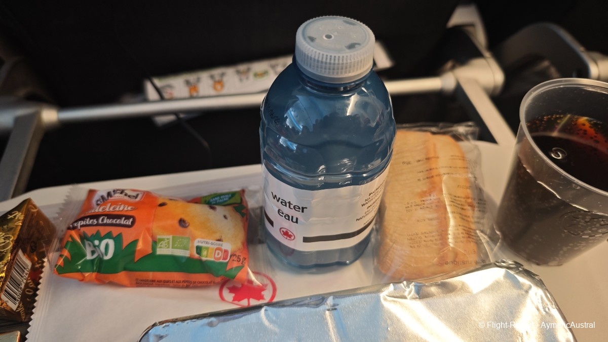 La dernière collation avant l'arrivée a Montréal nous est donné, on aura le choix entre un feuilleté au poulet ou végétarien, encore une fois notre choix se portera sur le poulet, On accompagnera le tout avec un jus, la bouteille d'eau est celle du repas que j'avais gardé. Par ailleurs, le service boissons chaudes n'aura pas était proposé suite au turbulences durant tout le vol