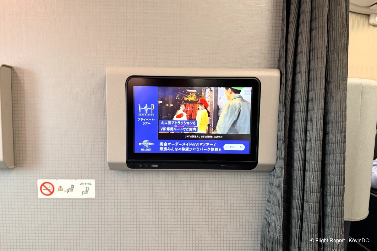 Each seat has access to a 110v universal power outless and USB-A port–there is also an additional USB port in the entertainment screen.