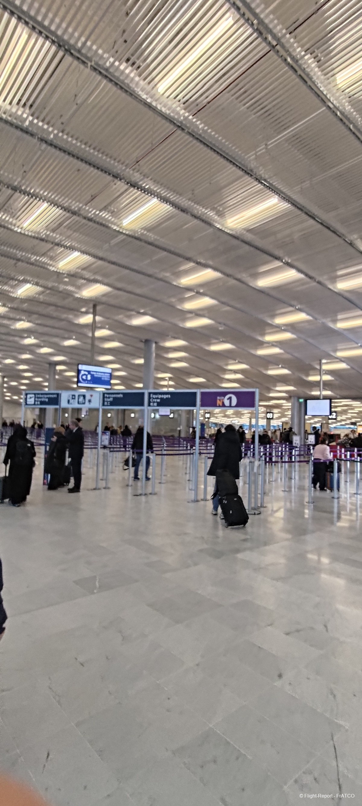 Il faut ensuite revenir sur ses pas pour passer le PIF à l'étage. Les files sont bien indiquées, mais comme presque toujours dans un aéroport ADP la file prioritaire débouche sur un portique commun à une autre file. C'est bien sûr mieux que rien, mais pas optimal. Les agents de sûreté faisaient en tout cas de leur mieux pour que l'écoulement des passagers soit le plus fluide possible.