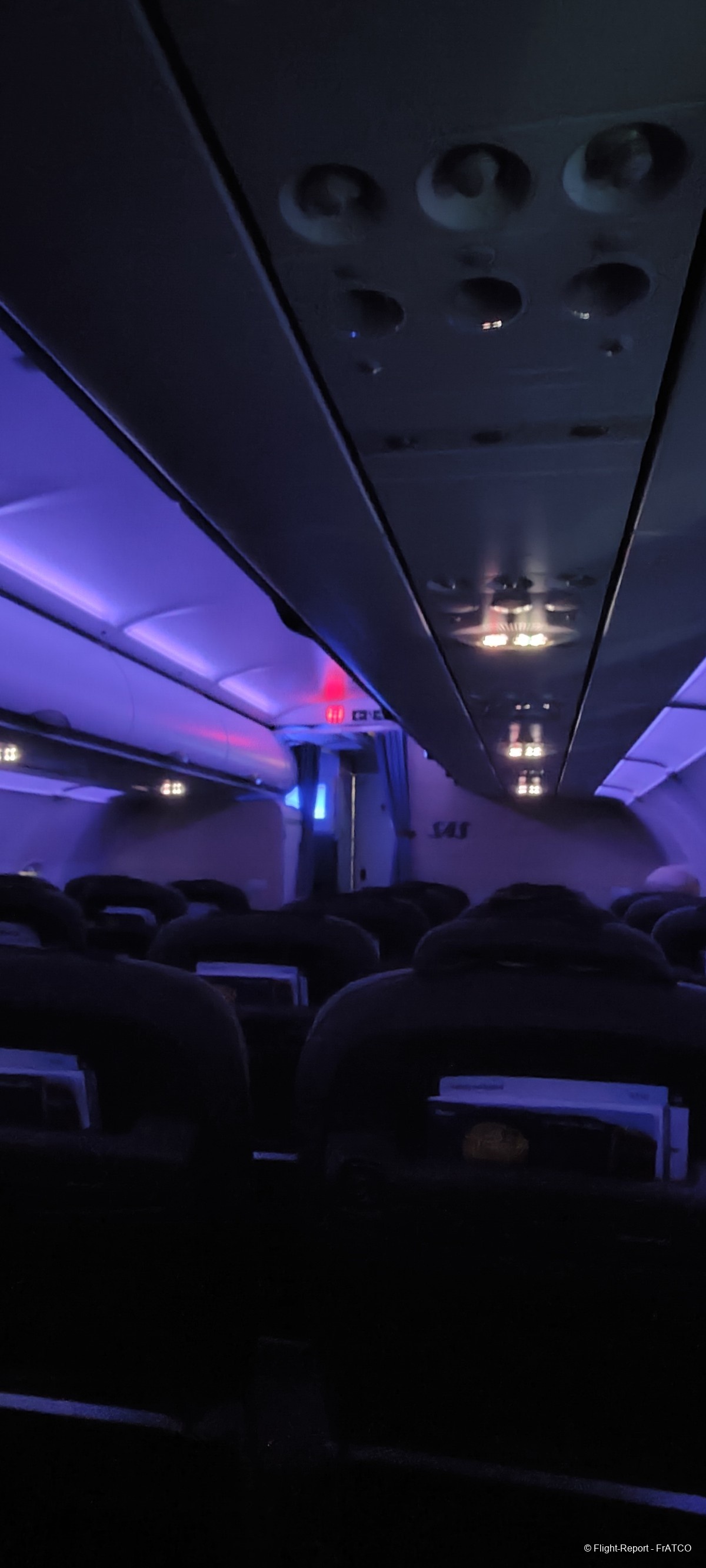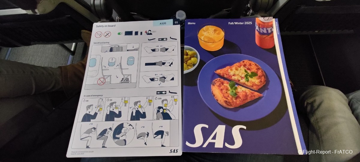 La cabine est plongée dans cette belle ambiance pendant la montée initiale, puis vient le service. Voici le menu et les consignes de sécurité.