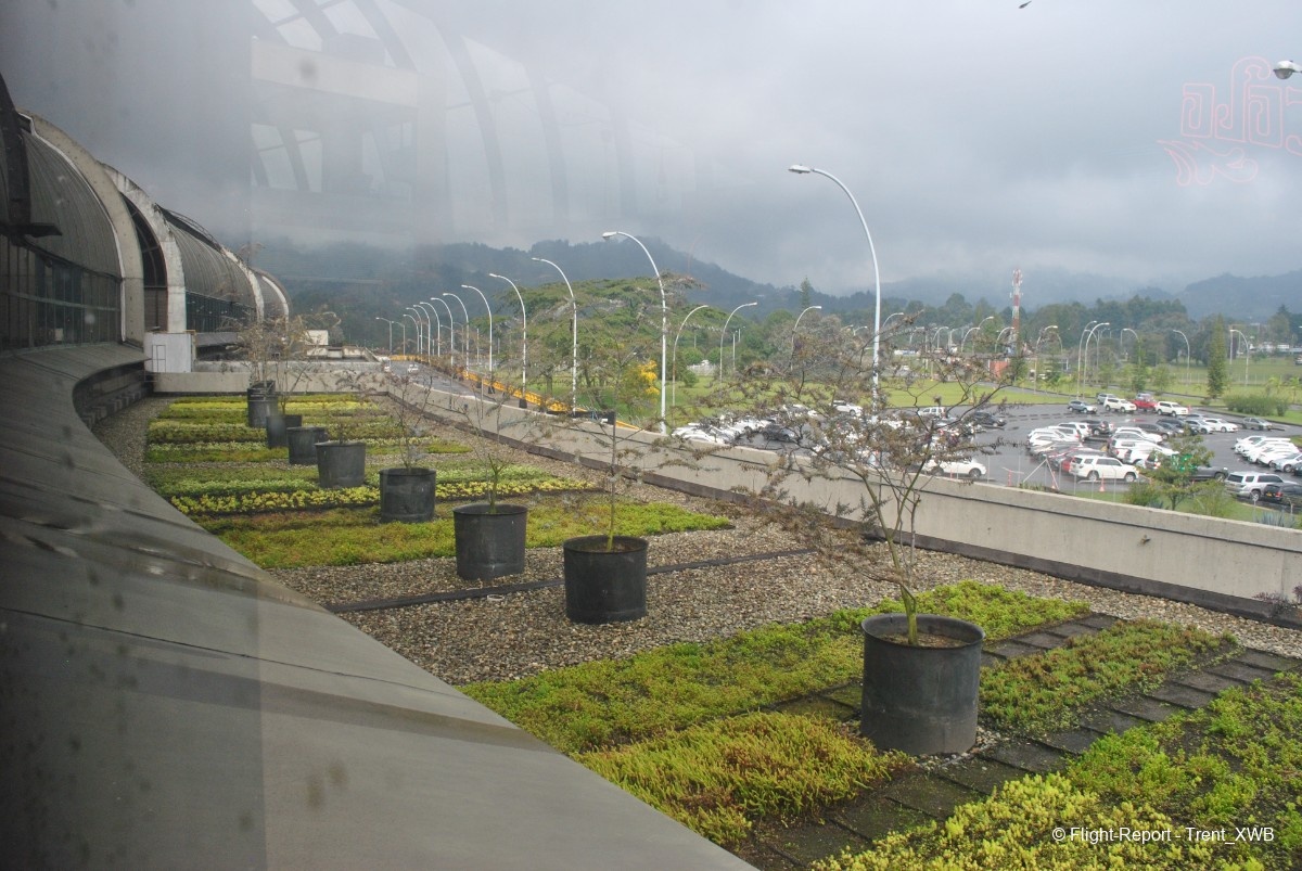 View of the terminal and its roof, and of the ATC tower from the mezzanine level, which is connected by bridges with the car parking.