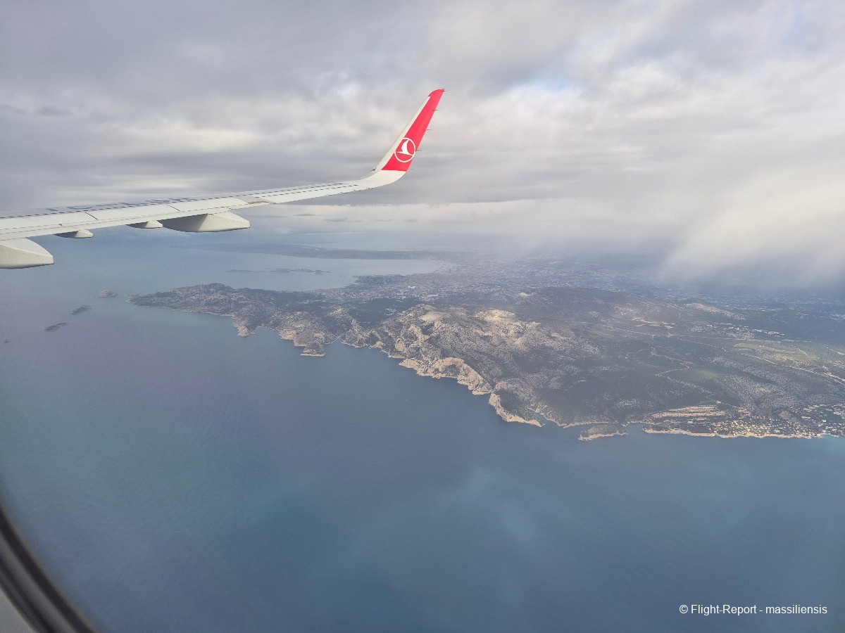 En transit depuis Hong-Kong, j'enchaîne sur ce dernier vol à destination de Marseille. C'est l'un des deux vols quotidiens opérés par Turkish Airlines (TK) entre Istanbul et Marseille qui permet aux Provençaux d'accéder, via son hub stambouliote, à une grande variété de destinations vers le Moyen-Orient et l'Asie, entre autres. Un vol de 2000 km à contre-courant d'une durée de 3 heures, contre 2h30 dans le sens inverse.