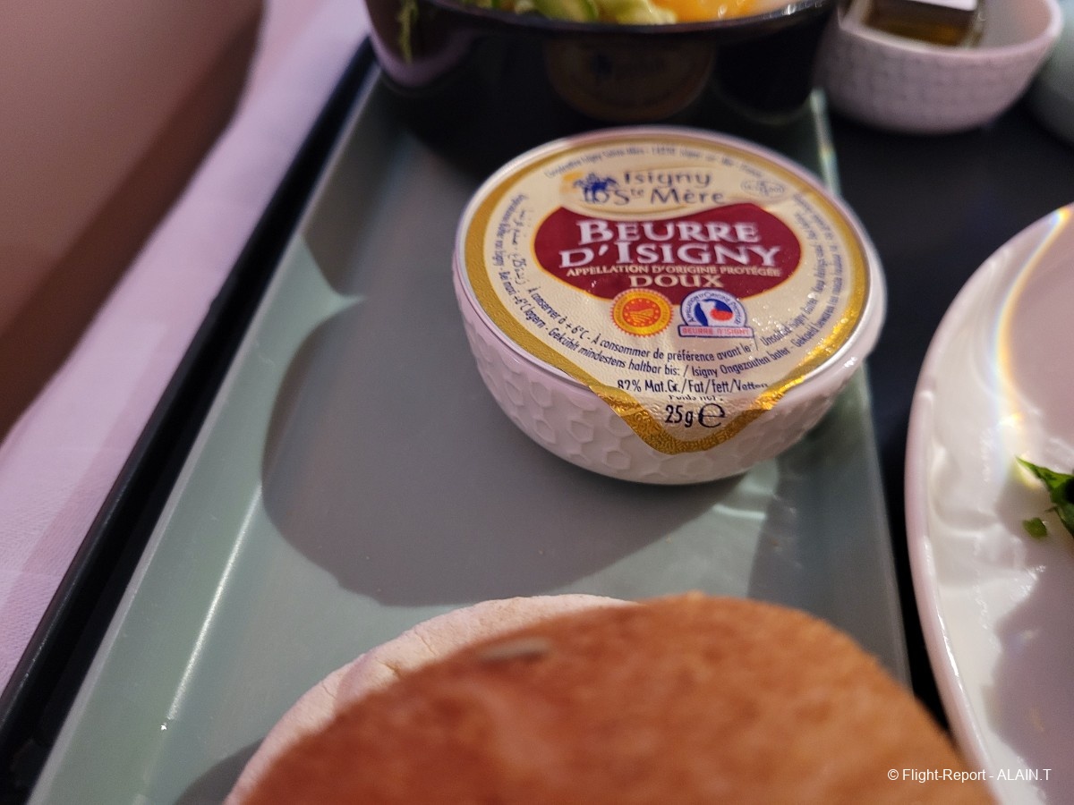 Puis arrive le plateau qui comprend l'entrée choisie, le pain chaud composé de deux boules, l'une avec graine et l'autre sans, la salade et la sauce, le beurre, un verre d'eau, sel et poivre dans un petit boîtier. Sans oublier la serviette qui contient les couverts.