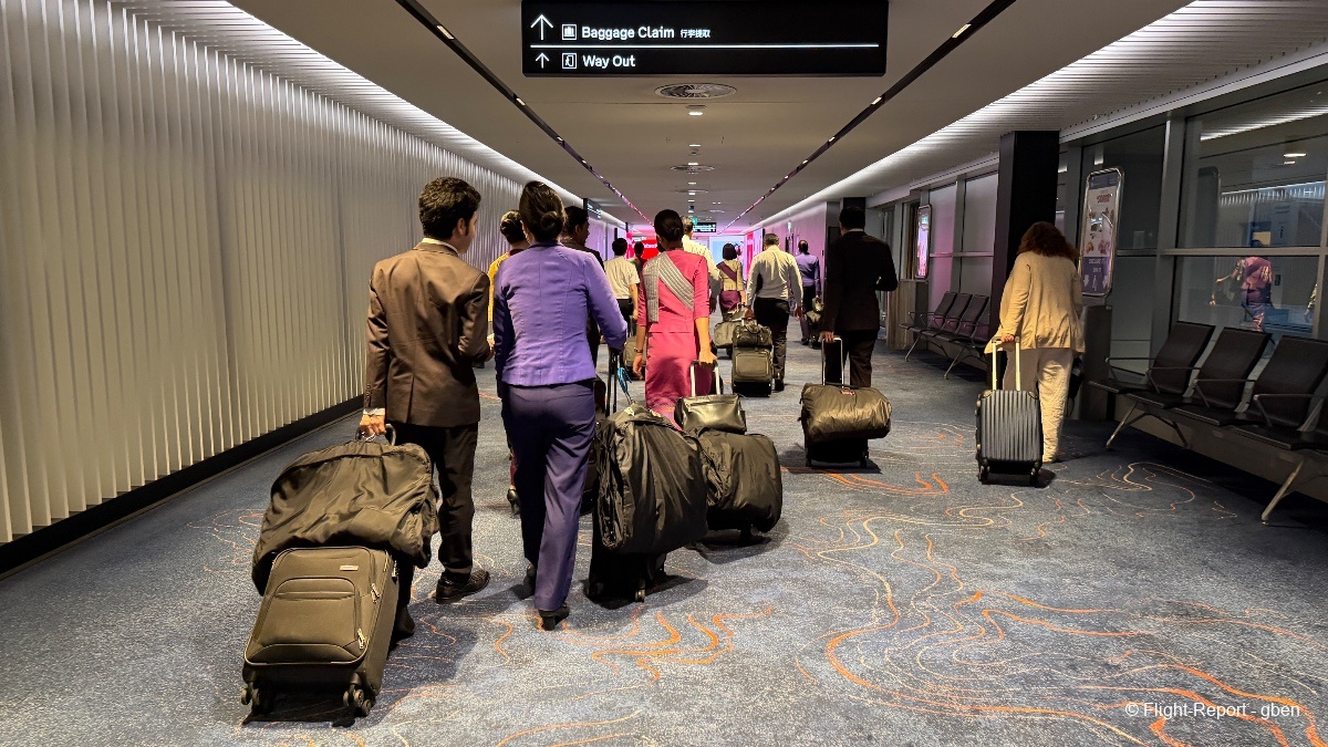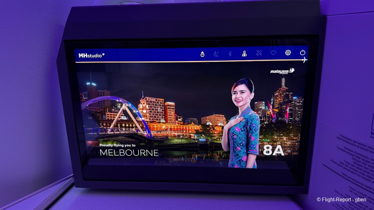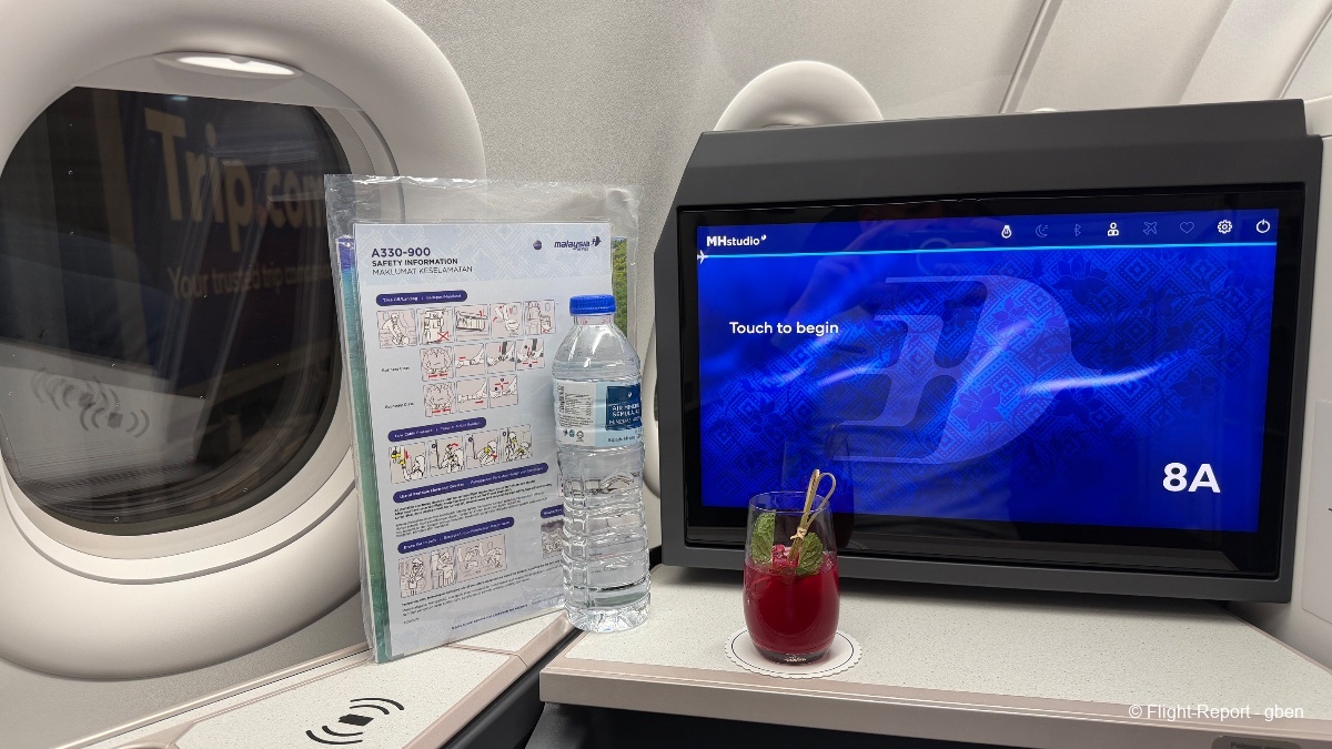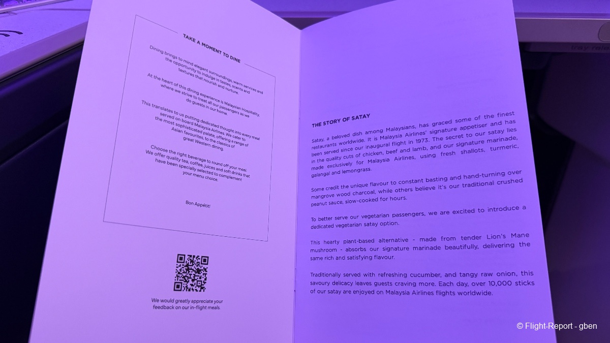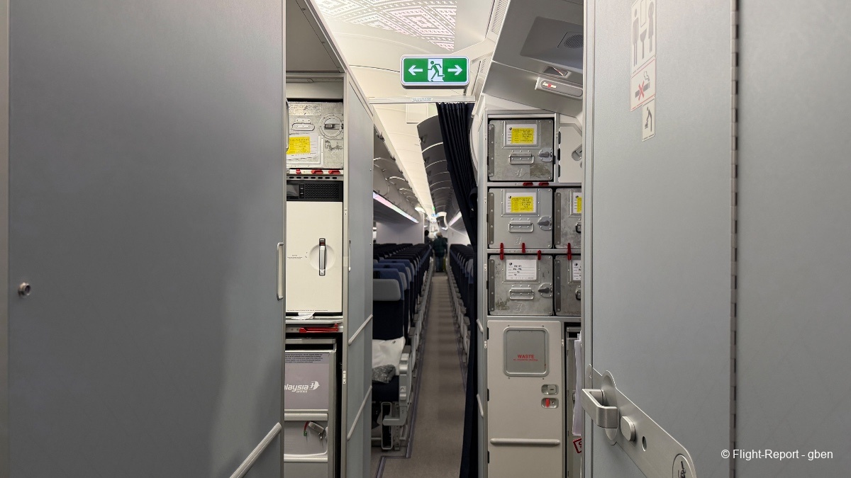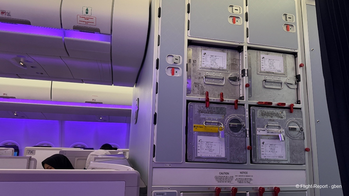La cabine est préparée ; l'équipage salue en tête de cabine les passagers en référence à l'hospitalité malaisienne.