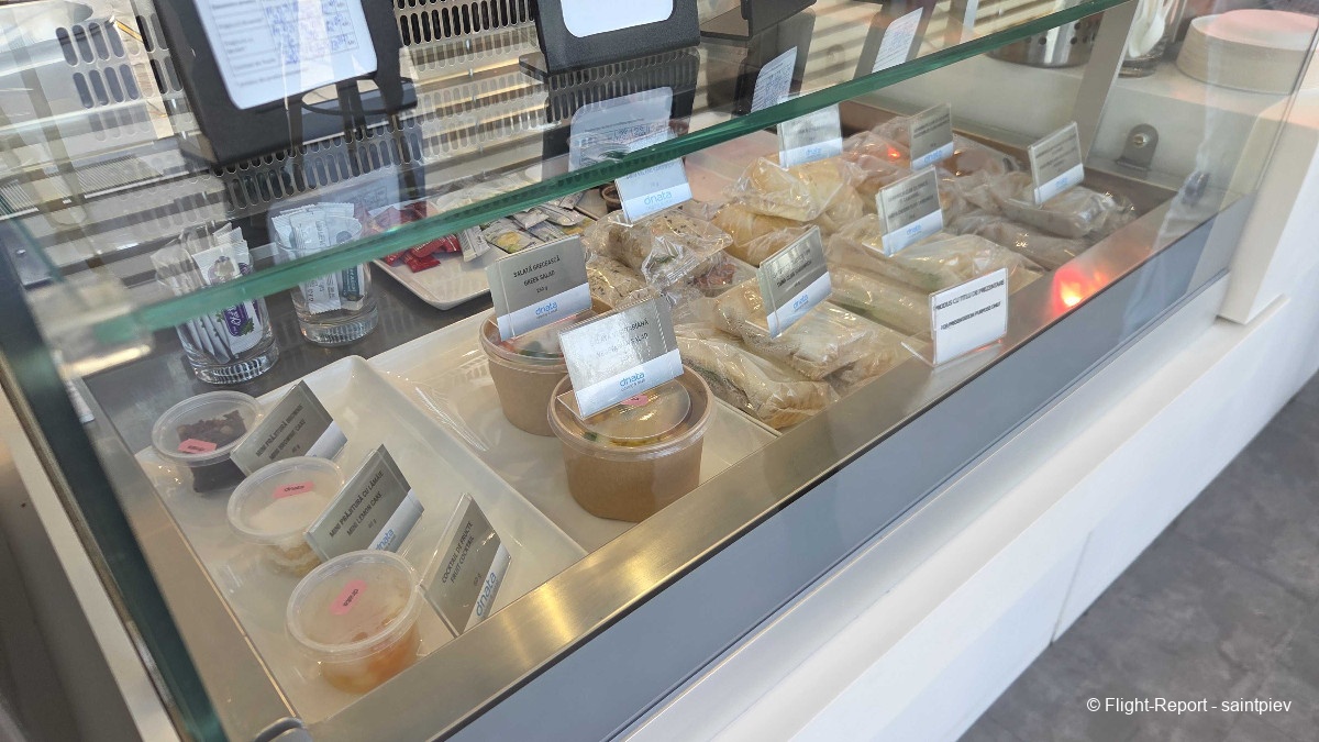 Très vite le service se met en place : sandwich végétarien (fromage), vin blanc et verre d'eau pétillante.