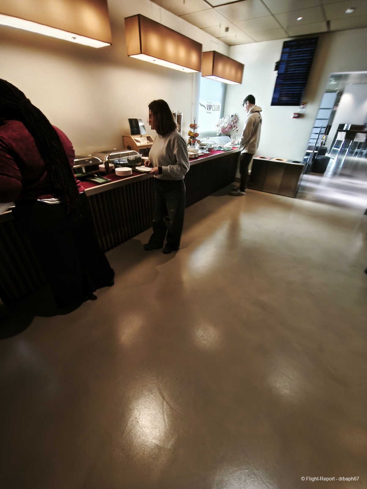 La PIF sera rapidement passée. J'évolue ensuite dans les couloirs monotones et étroits de FLR pour en arriver au VIP Lounge. Je passerai 1h30 dans ce lounge à bruncher. L'offre variée est appréciable mais le lieu est très étroit.