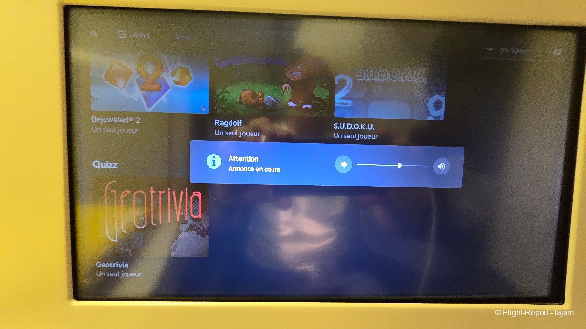 Message du commandant de bord. 9h05 de vol avec une arrivée à l’heure. Donc départ retardé de dix minutes