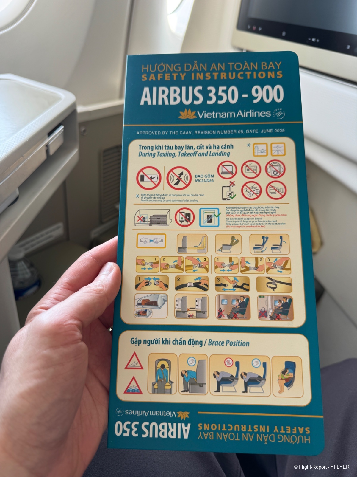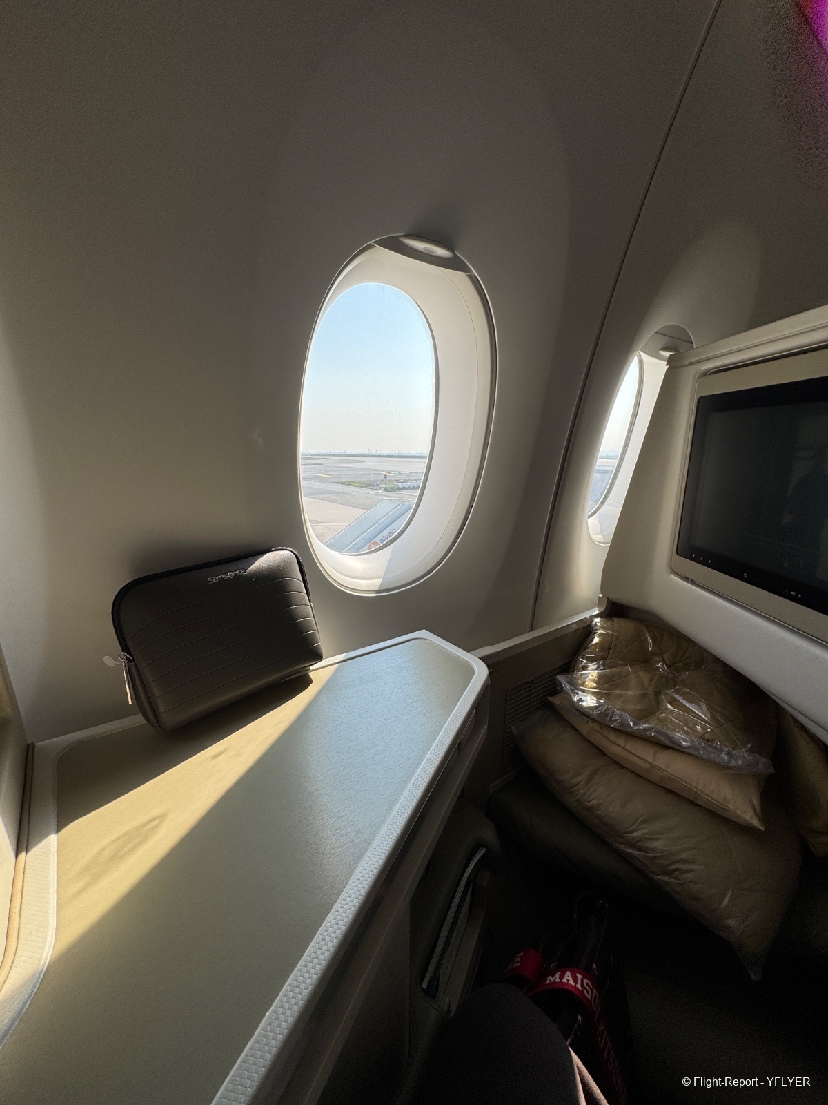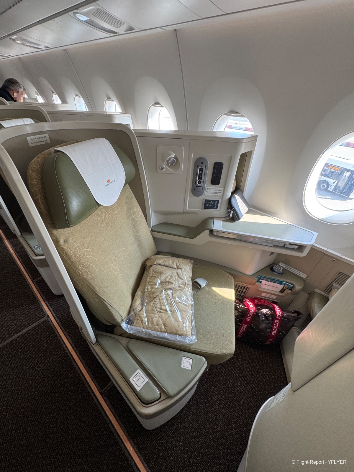 Aujourd’hui, c’est un Airbus A350‑900 immatriculé VN‑A890, un appareil qui approche les dix ans. La cabine business est configurée en épis, et je m’installe à mon siège côté hublot. Le produit n’est pas le plus récent du marché, mais il reste propre, fonctionnel et bien entretenu.