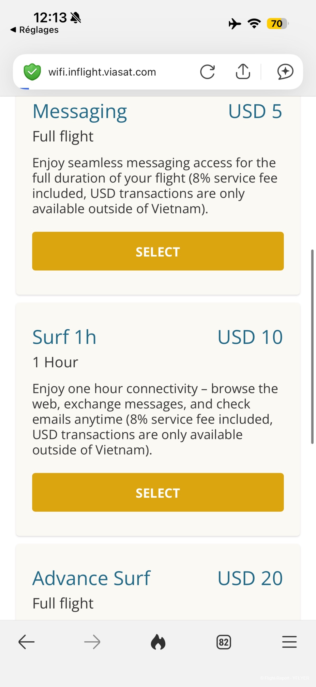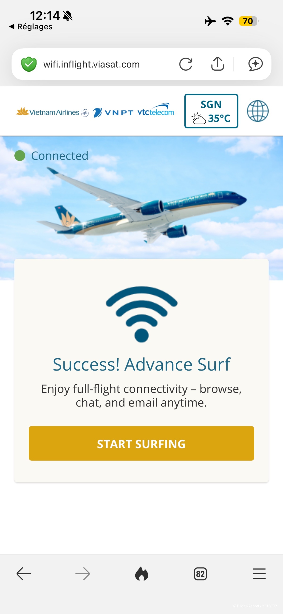Elle me remet ensuite un petit post‑it avec un code wifi gratuit, ce qui me surprend : je ne pensais pas que VN proposait le wifi sur ce vol. Le code correspond à leur formule « Advance Surf », normalement facturée 20 USD.