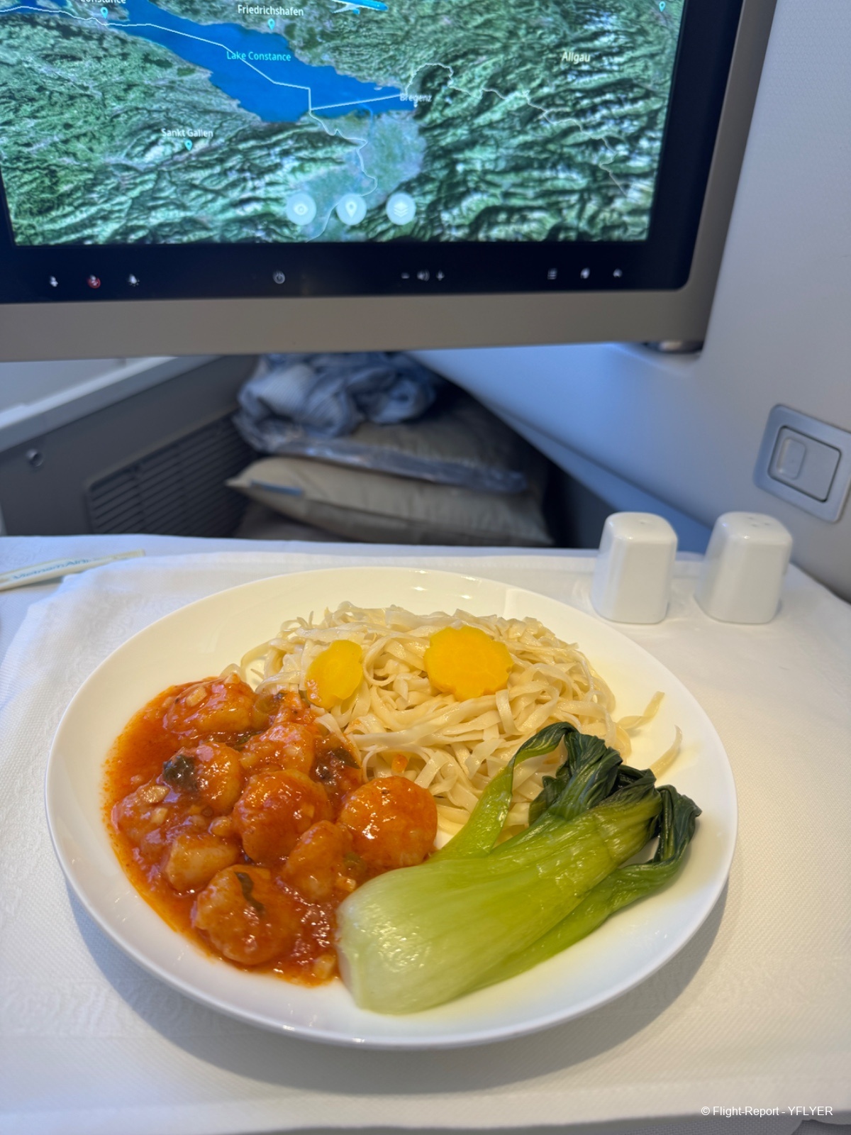 • Qualité des plats : à ma grande surprise, les saveurs sont au rendez-vous. Les crevettes sont trop petites et mériteraient mieux pour le la classe affaire, les nouilles bien assaisonnées, et les portions suffisantes.