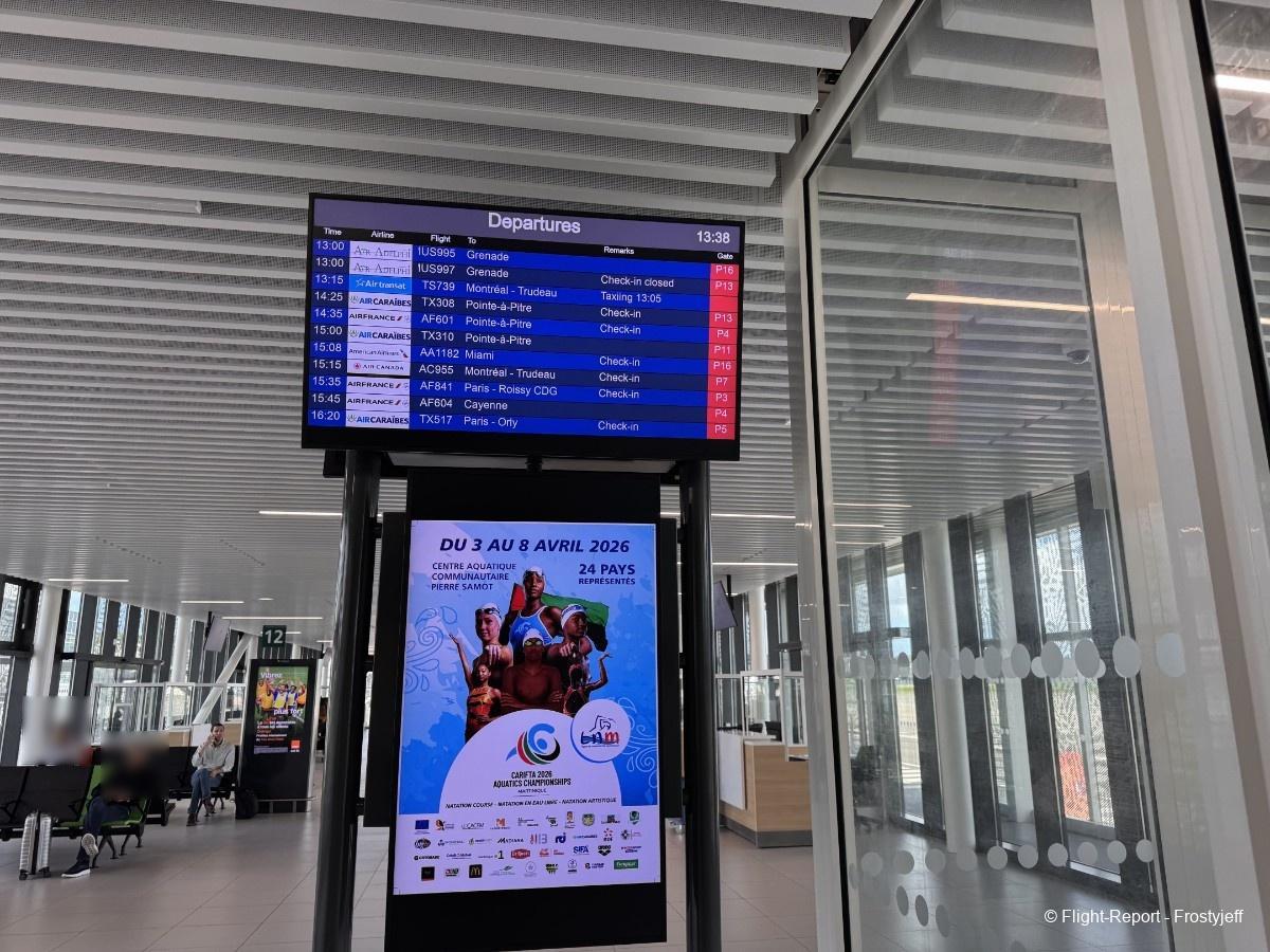 Merci pour le report, Le 737 Max, dont tu avais oublié le nom est un Cayman airways et est directement lié à la photo suivante ainsi qu’à la publicité sous le FIDS. Il s’agissait d’un vol spécial transportant des athlètes martiniquais participant aux CARIFTA Games aux Grenadines.