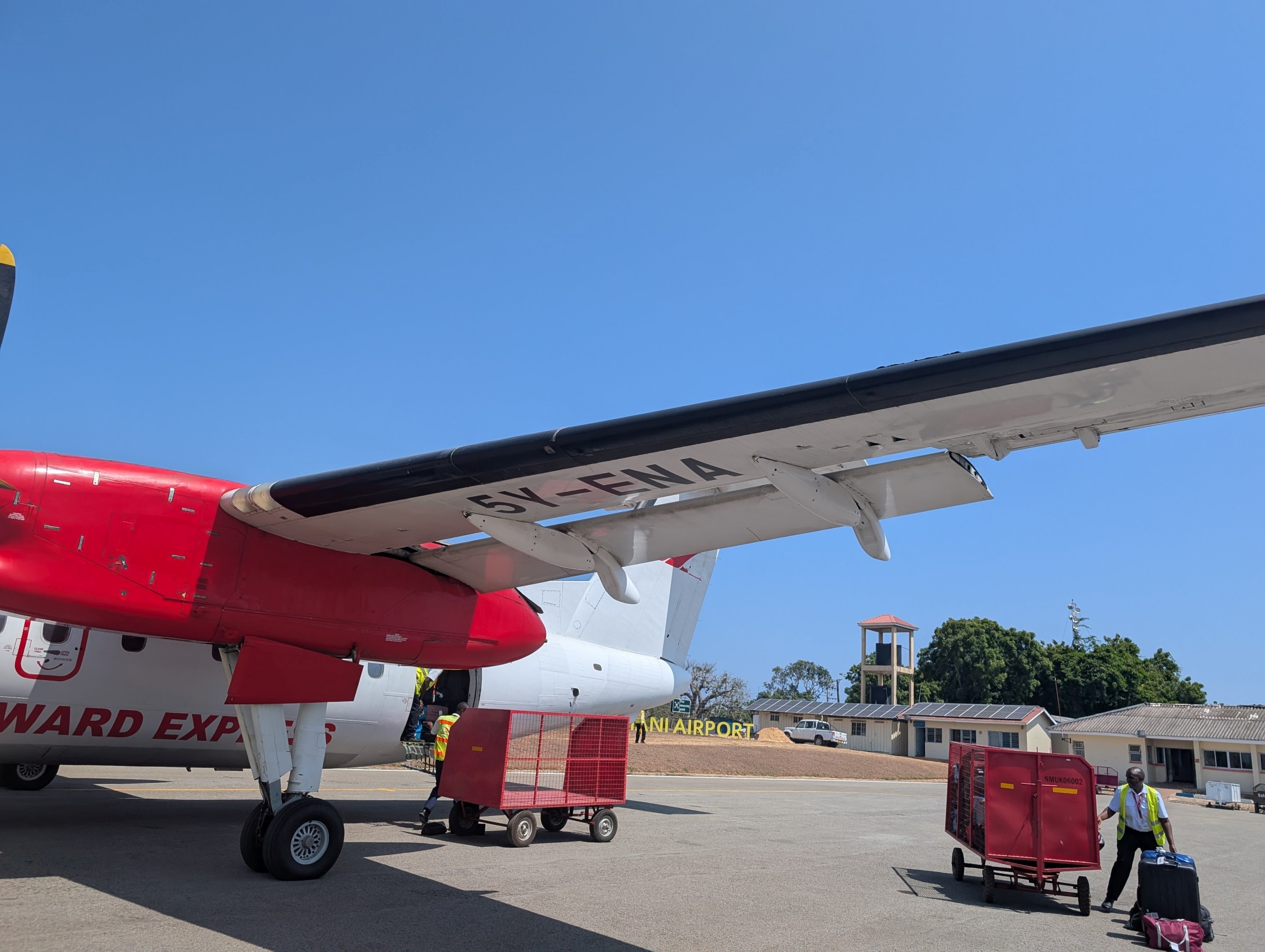 L'aéroport de Wilson étant construit en plein centre de Nairobi, notre taxi nous y mène en quelques minutes et chemine jusqu'aux bureaux de Skyward Express, l'aéroport n'étant pas constitué autour d'un terminal mais de plusieurs petits édifices accueuillant chacun de 1 à 4 compagnies.